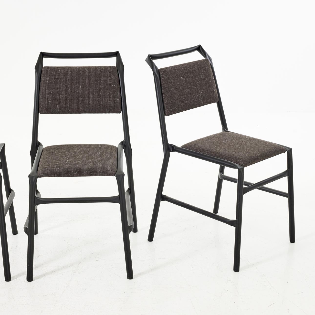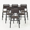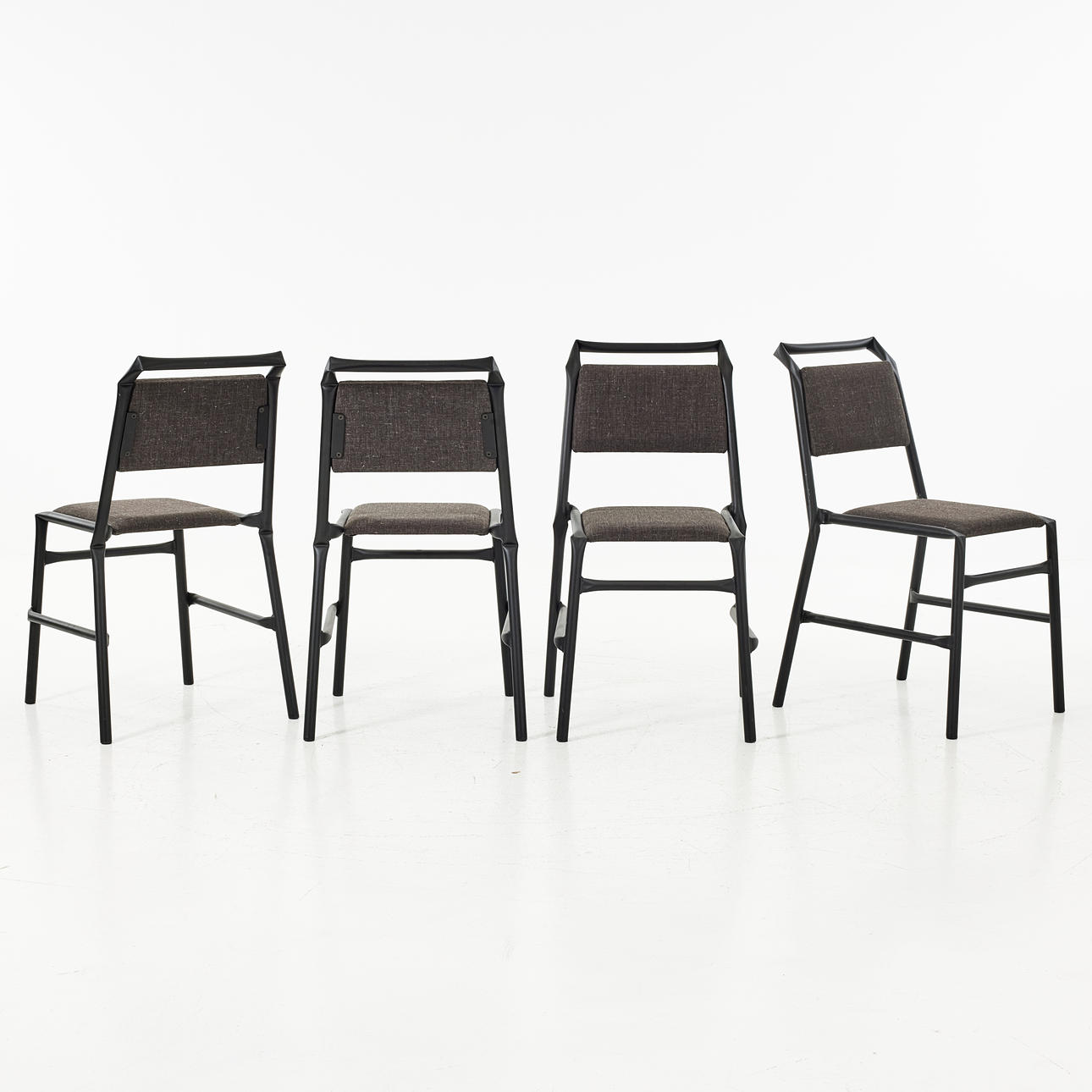 Stomme av lackerat stålrör, stoppad sits och rygg med textilklädsel. Etikettmärkta. Sitthöjd ca 46 cm.
