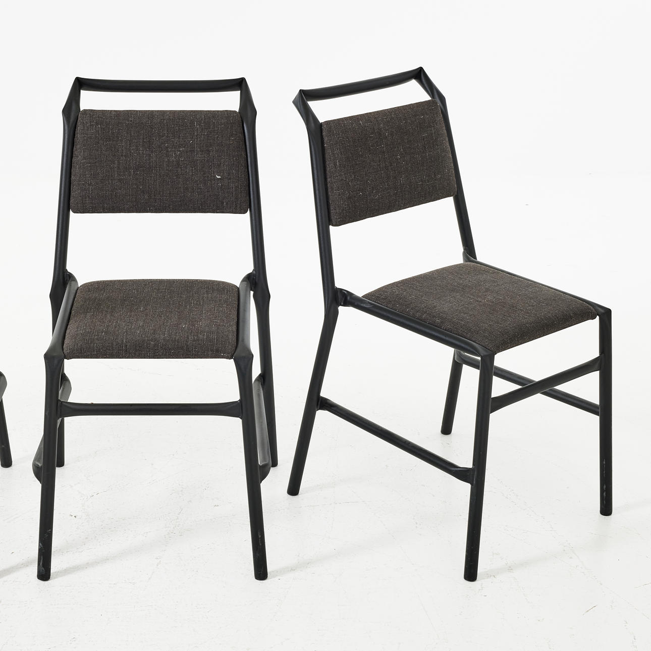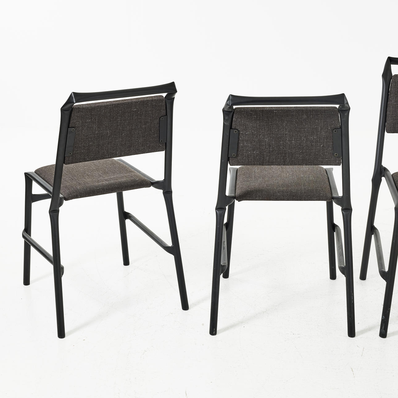 Stomme av lackerat stålrör, stoppad sits och rygg med textilklädsel. Etikettmärkta. Sitthöjd ca 46 cm.