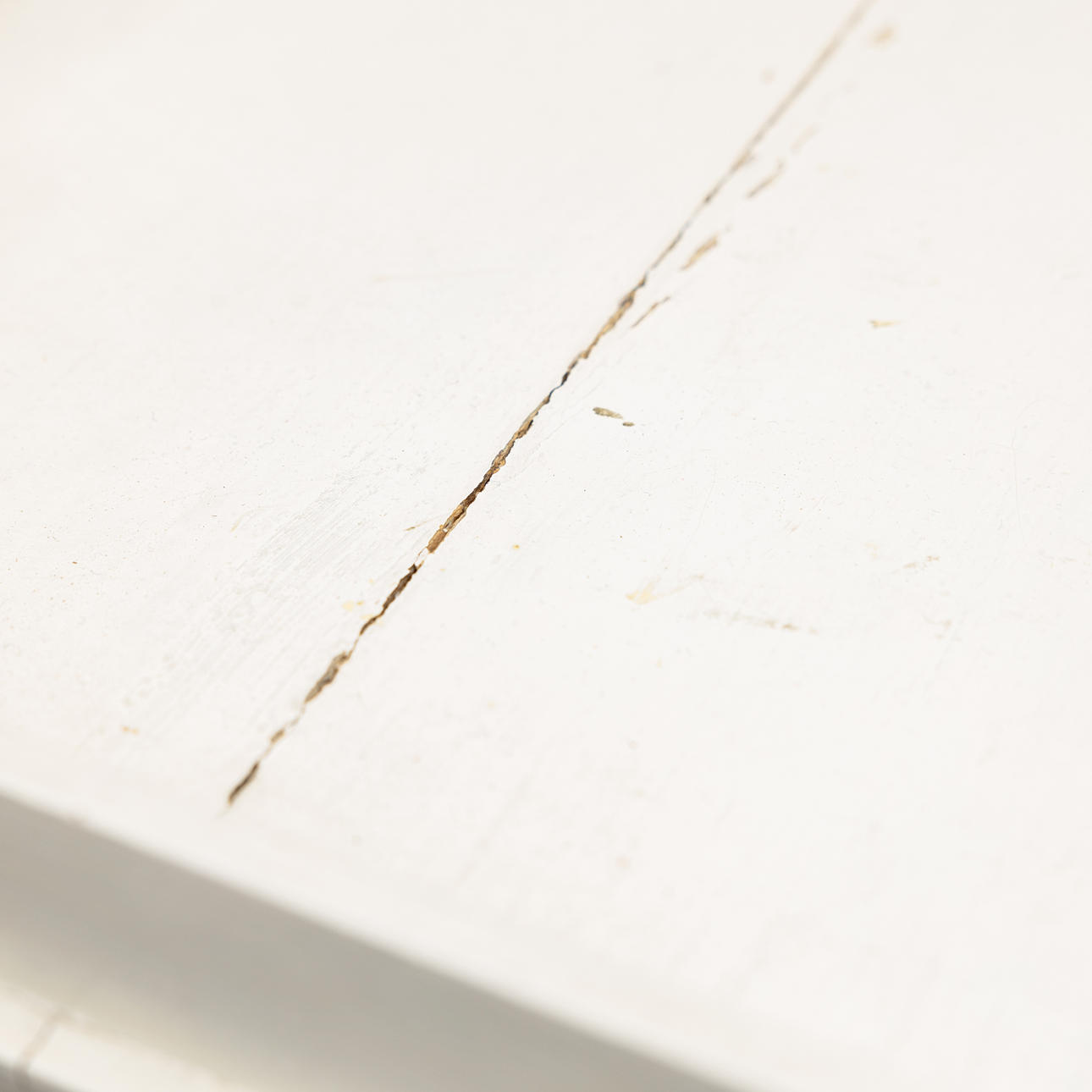 Ålders- och bruksslitage, senare målning, färgbortfall, sprickor och lagningar. baksida senare utbytt, handtag utbytta.