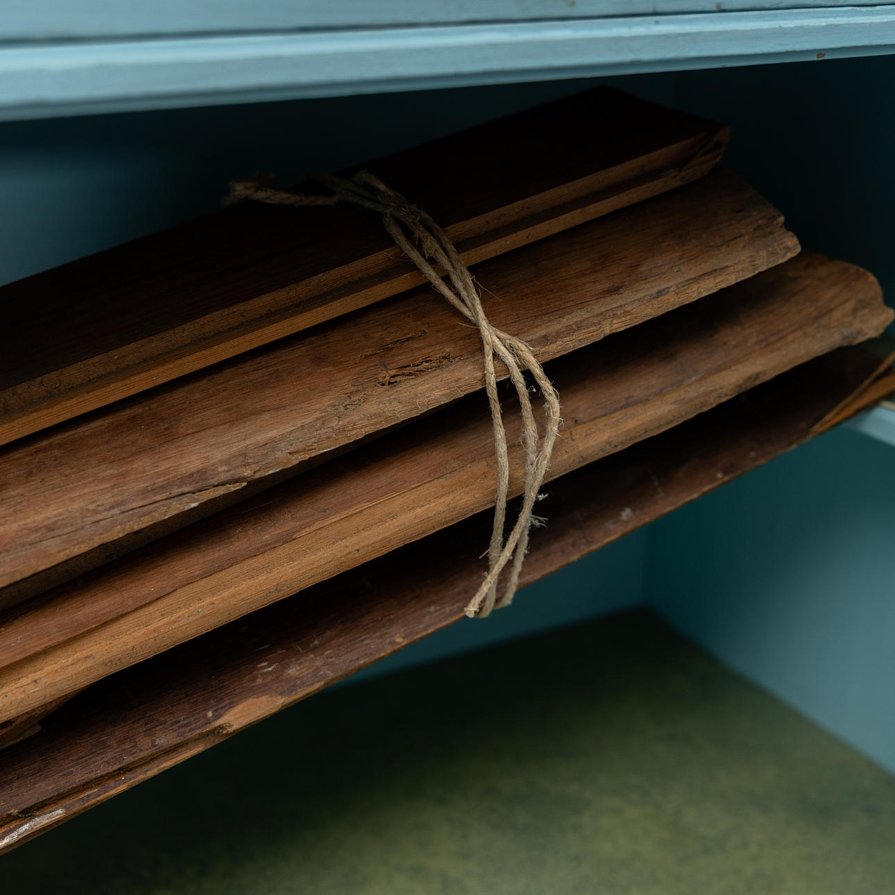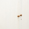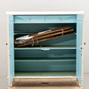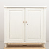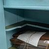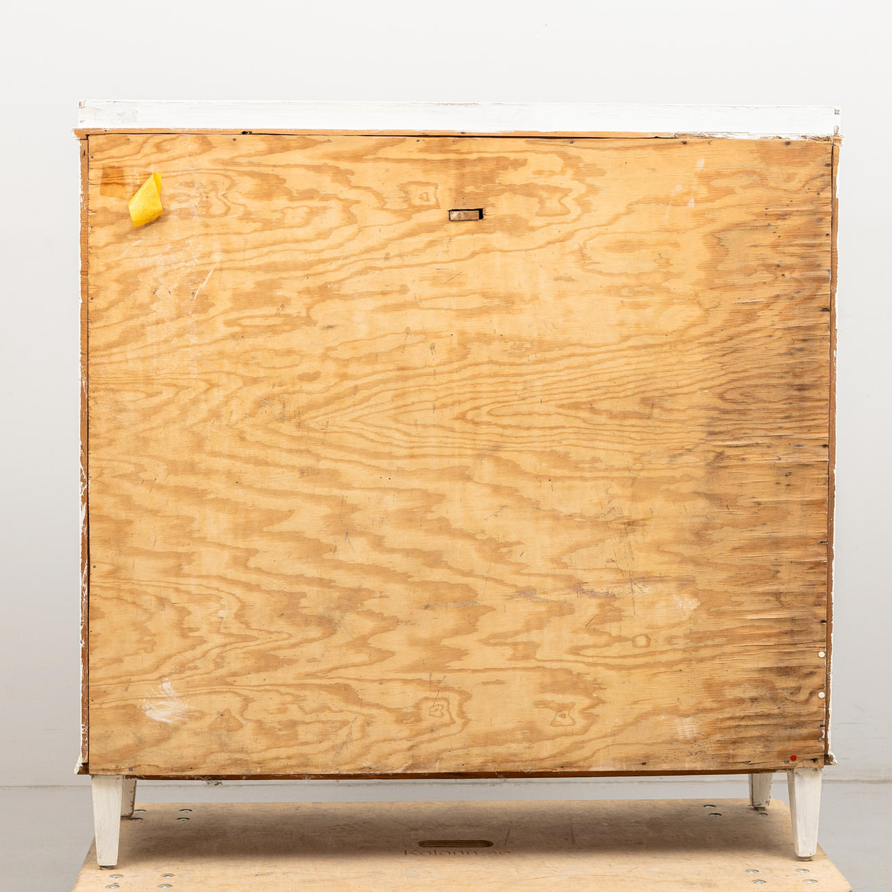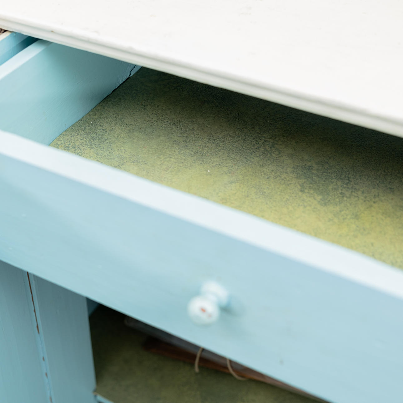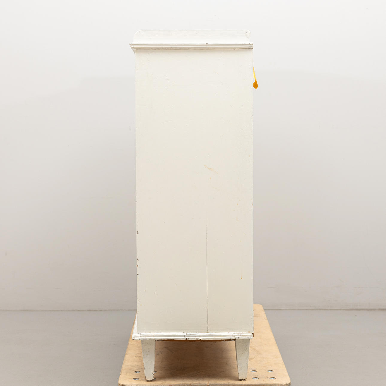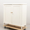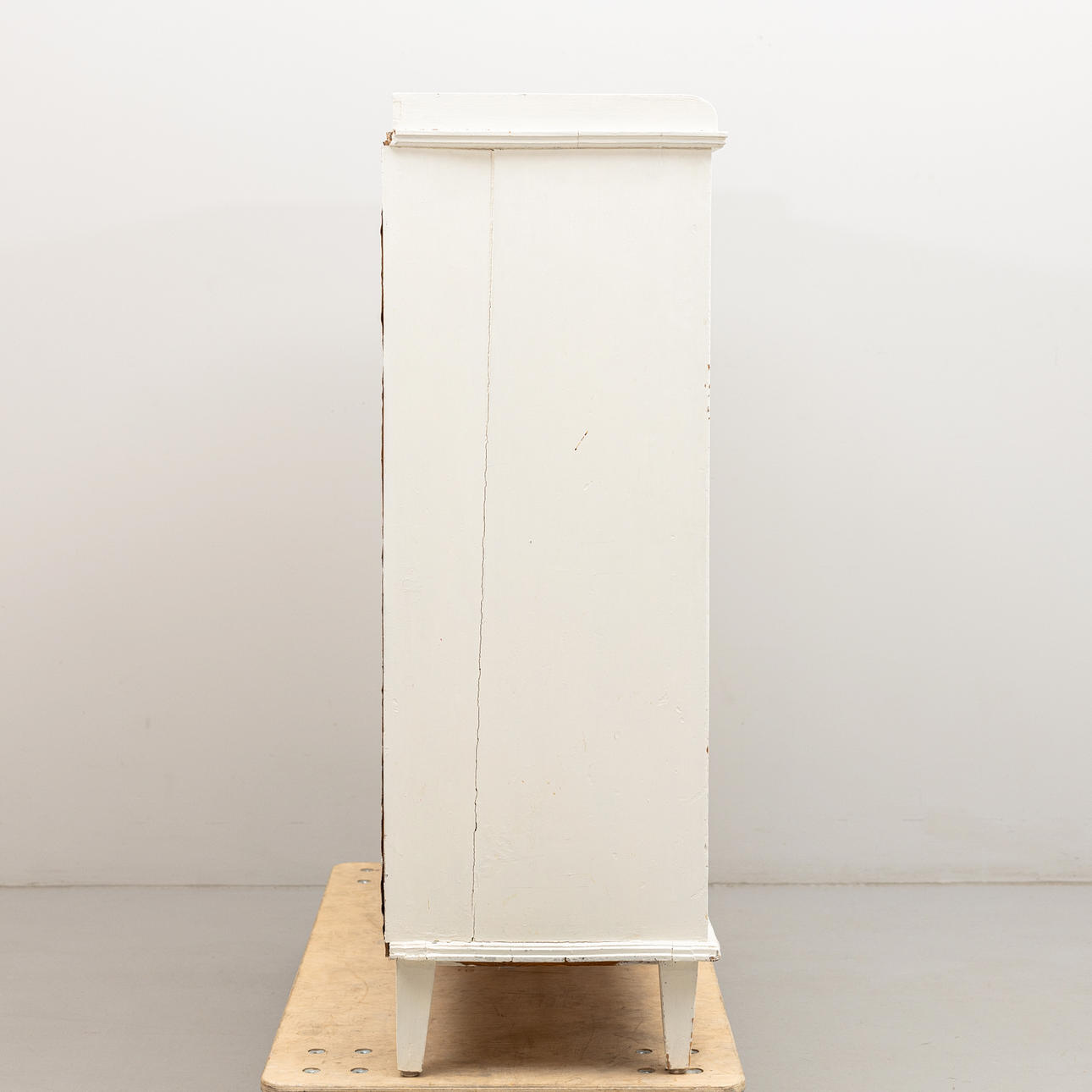 Omarbetad gustaviansk skänk, utvändigt vitmålad, invändigt blåmålad, dubbla luckor med räfflade fyllningar.