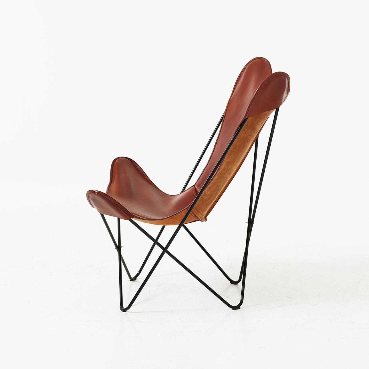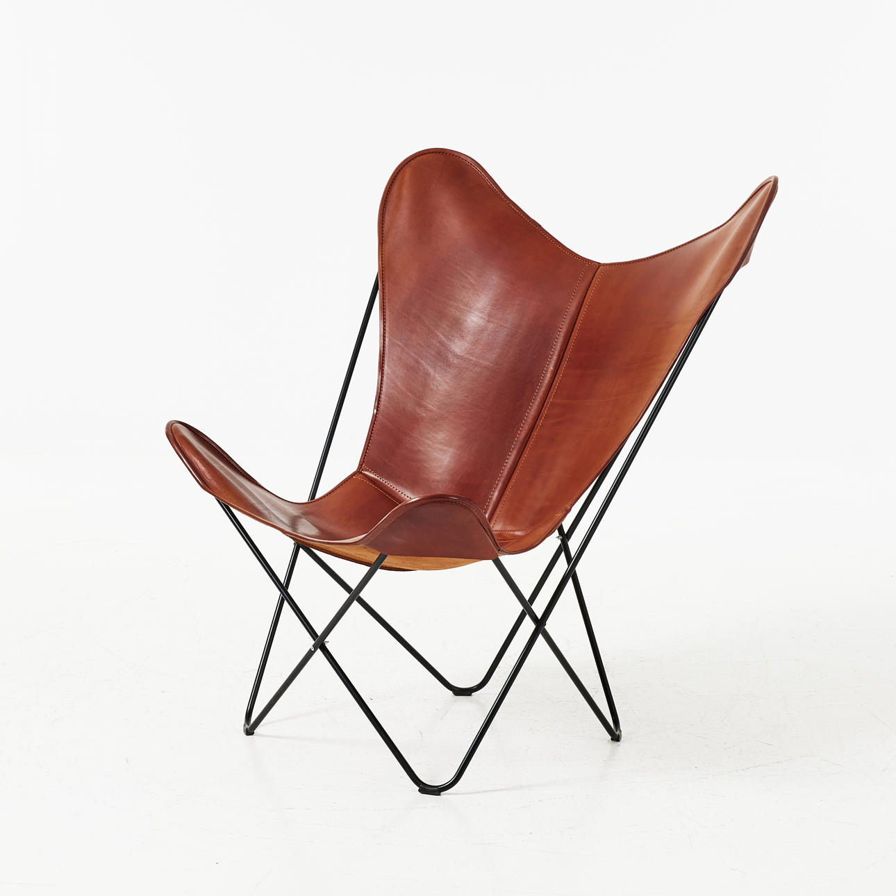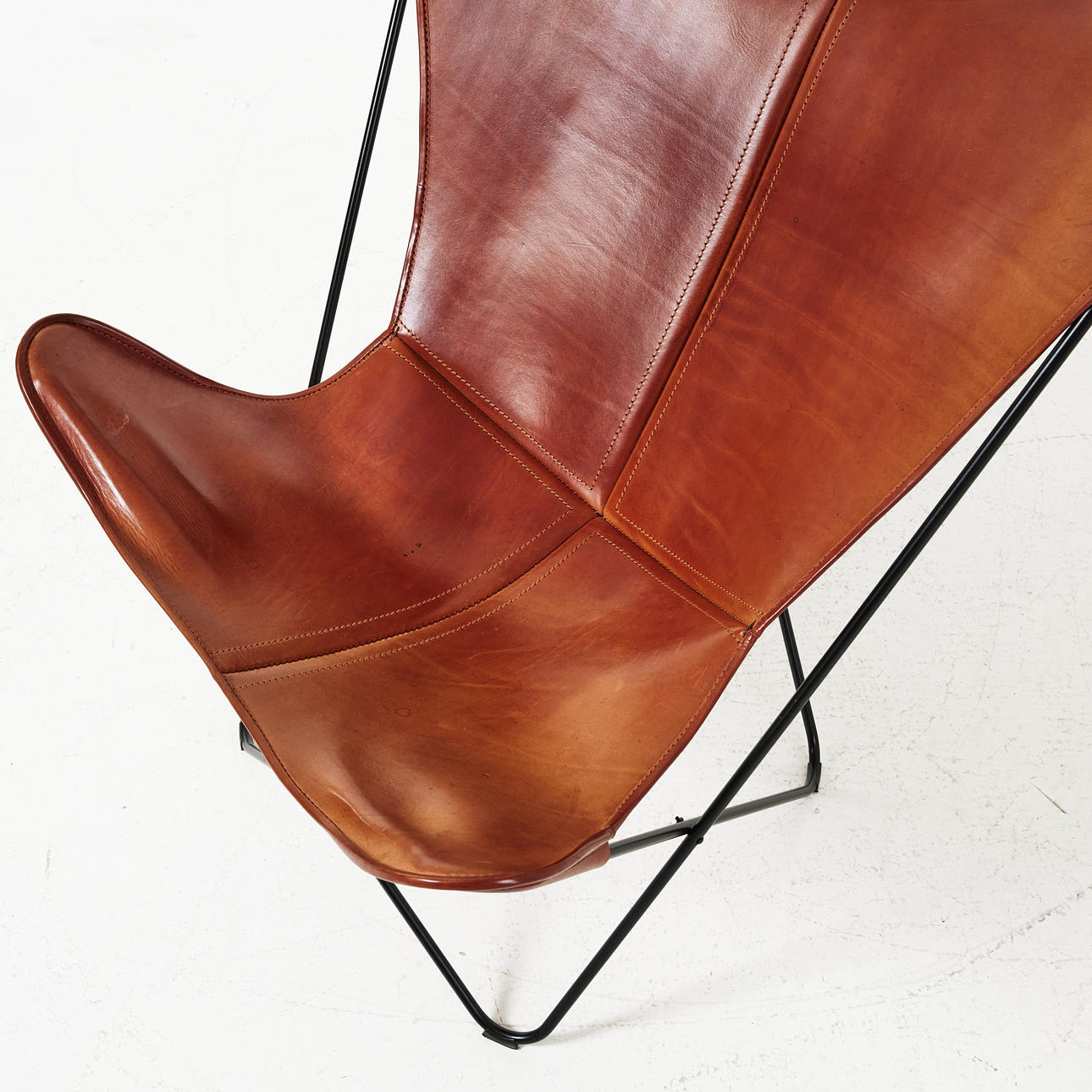 svartlackerad stomme, sits i cognacsfärgat läder, sitthöjd ca 35 cm.