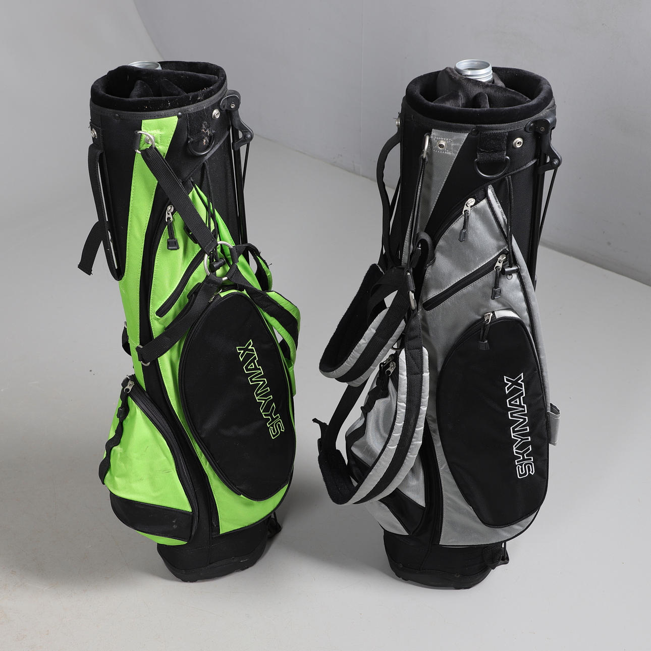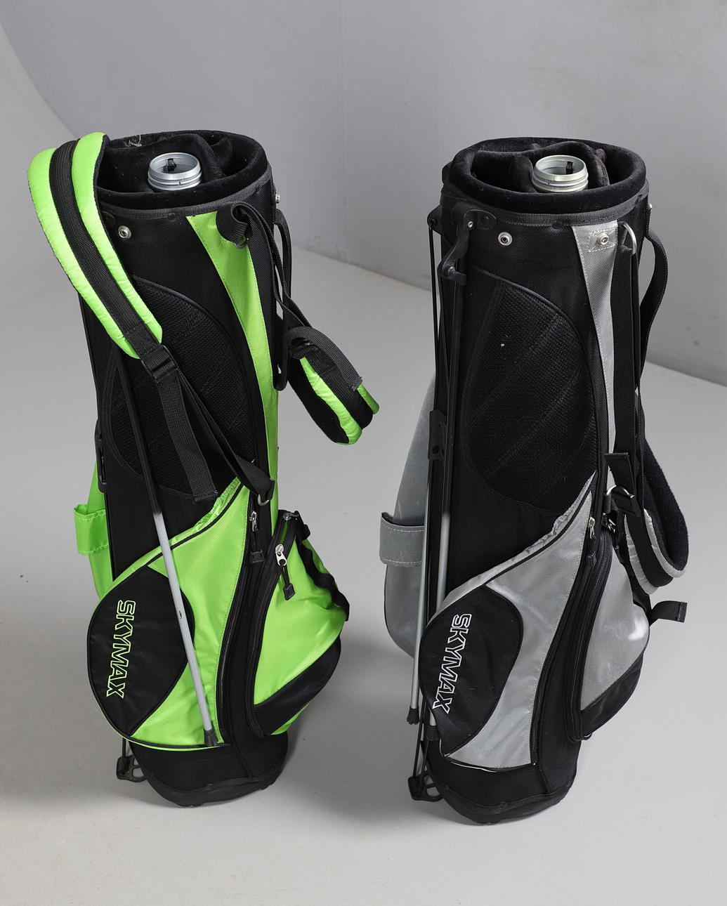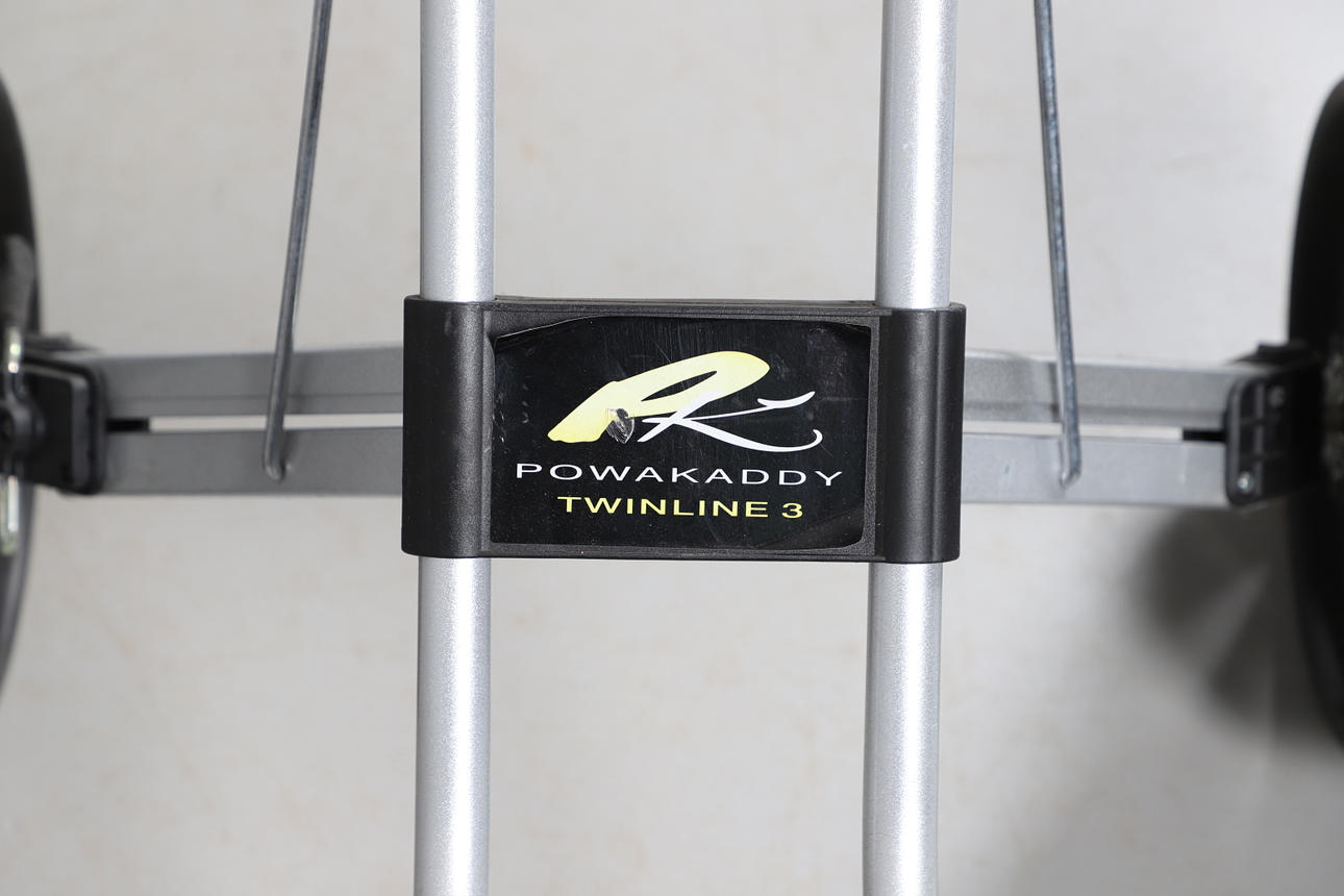 Ett blandat parti inklusive två Powakaddy Twinlines golfvagnar, och två golfväskor från Skymax. (4).