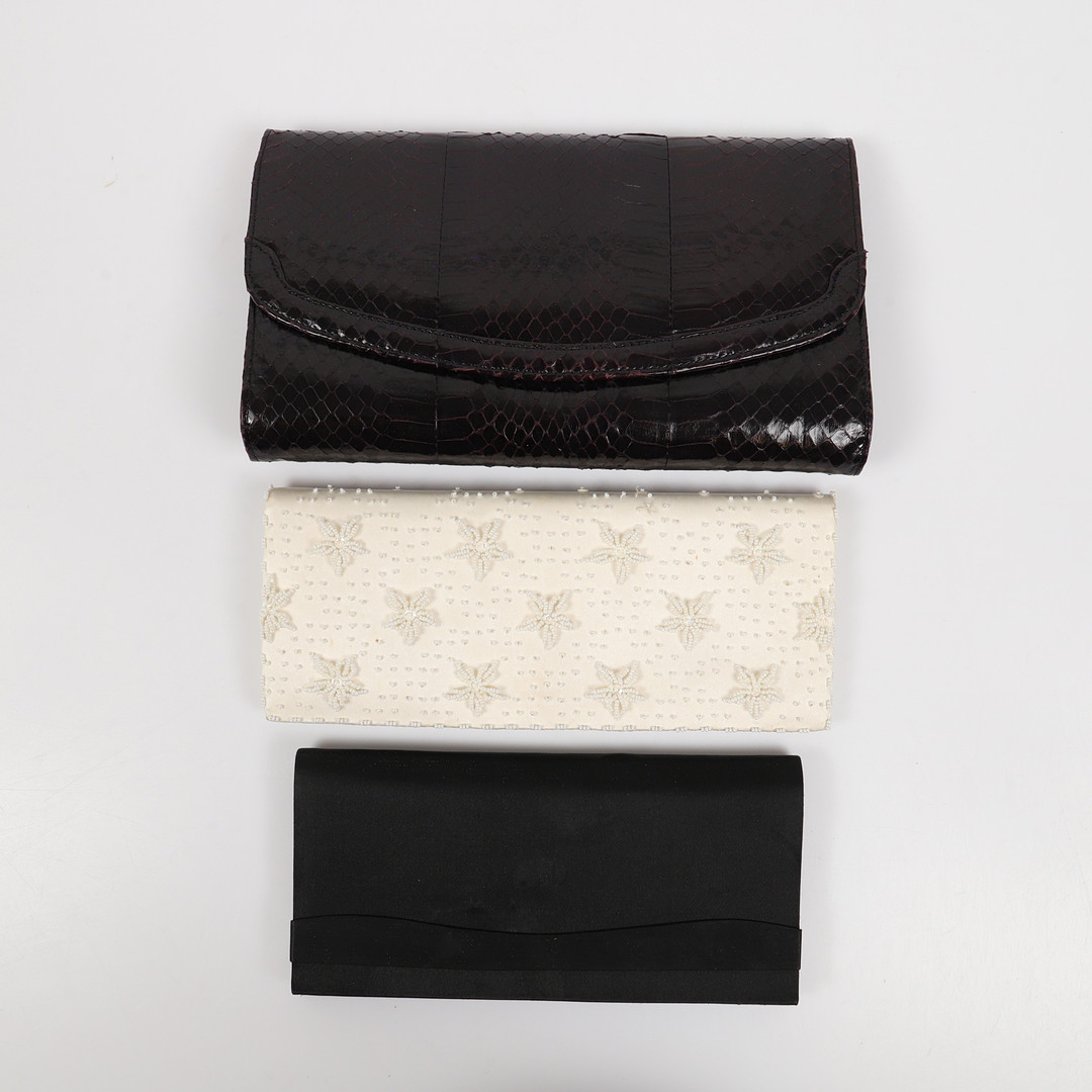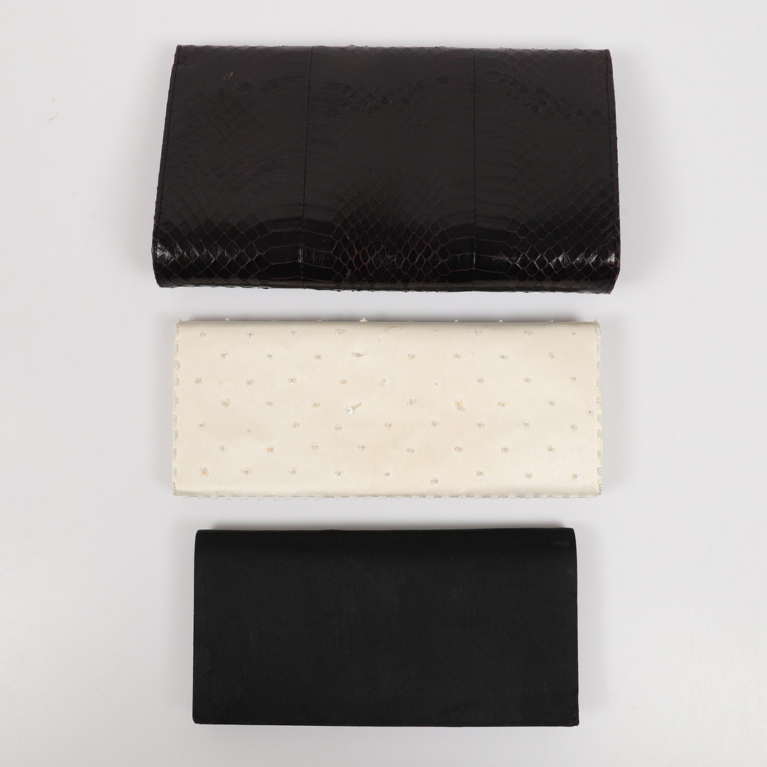 3610094. KUVERTVÄSKOR, 3 stycken, ormskinn/textil med paljetter, 1900-tal.