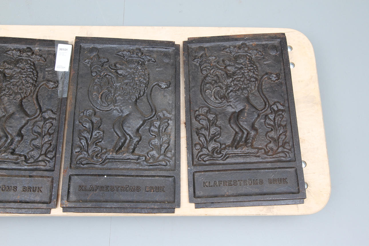 Gjutna ornament med bl.a krönt lejon,Klafreströms bruk.53x32 cm. 2 st.med kant till vänster,en till höger.