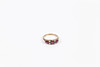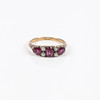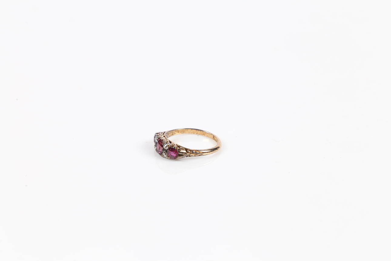Tre graderade ovala mixskuren syn. rubiner. Princip syn. rubin mäter 5,5 x 4mm. Avståndsdelar, fyra gammalslipade diamanter, TDW ca. 0,20 ct. Bläddra i galleriet. Gul metallmonterad, stämplad '18ct'. Fingerstorlek M. Vikt 2,8 g.