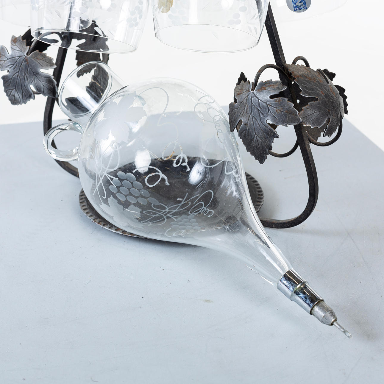 3611245. VINBEHÅLLARE, glas och smide med remmare.