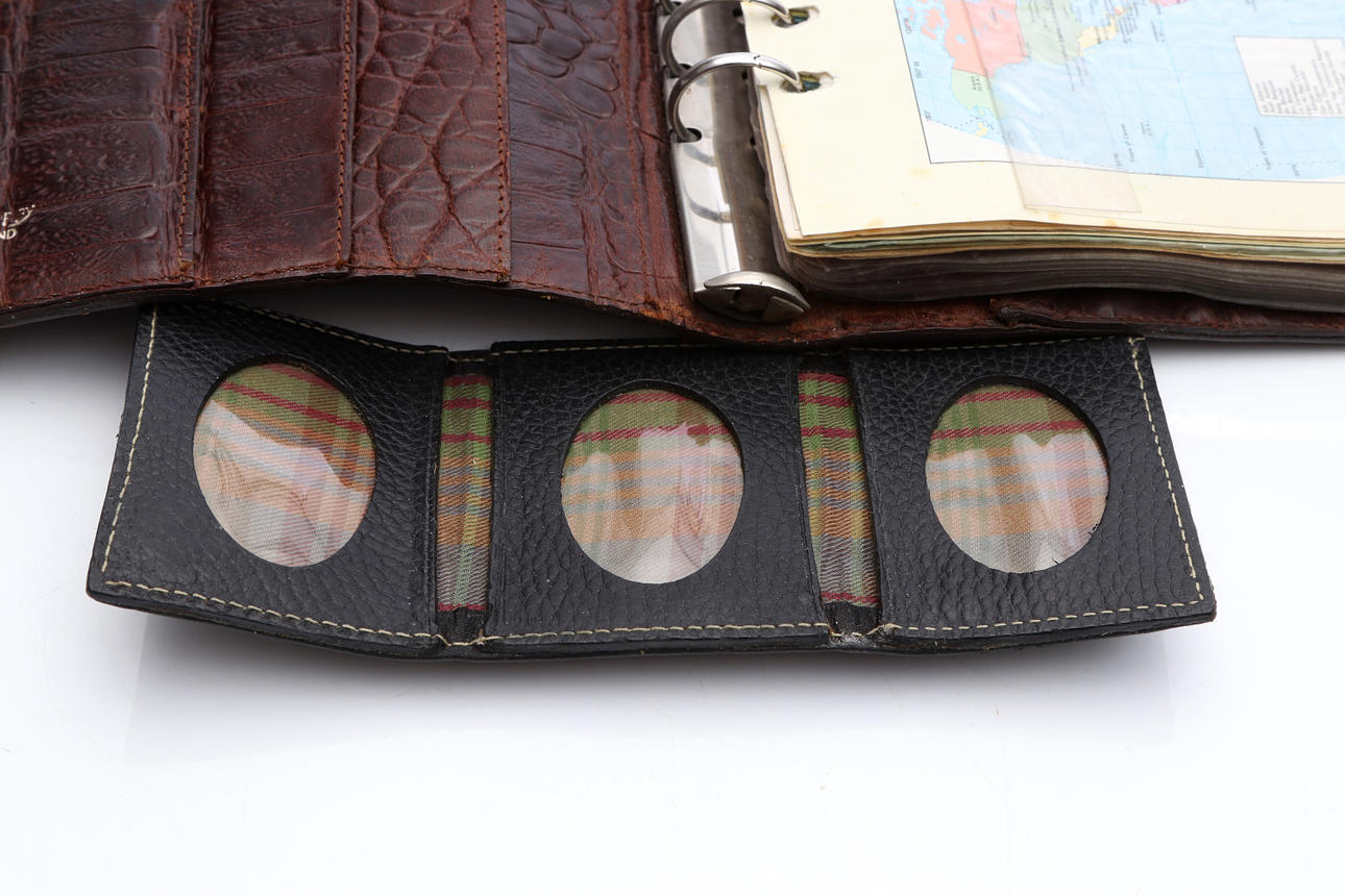 Insidan av pärmen med flera fickor samt ett dragkedjeförsett fack. Märkt Mulberry Company Made in England. Medföljer ett portabelt fotoalbum för tre foton.