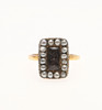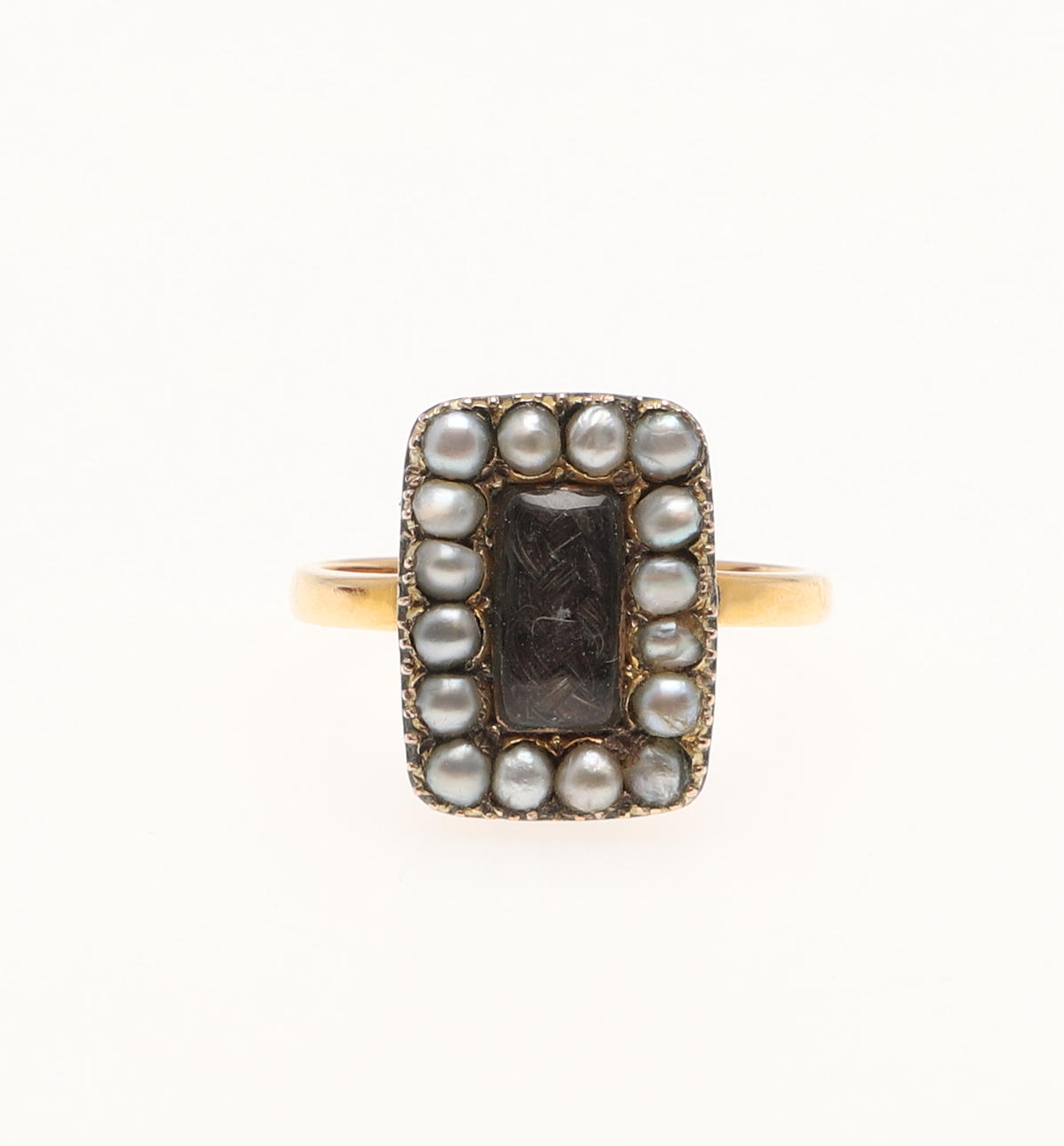den rektangulära ramen med vävt hårcentrum kantad av halva pärlor monterade på senare 22 karat guldskaft 4,8 g totalvikt.