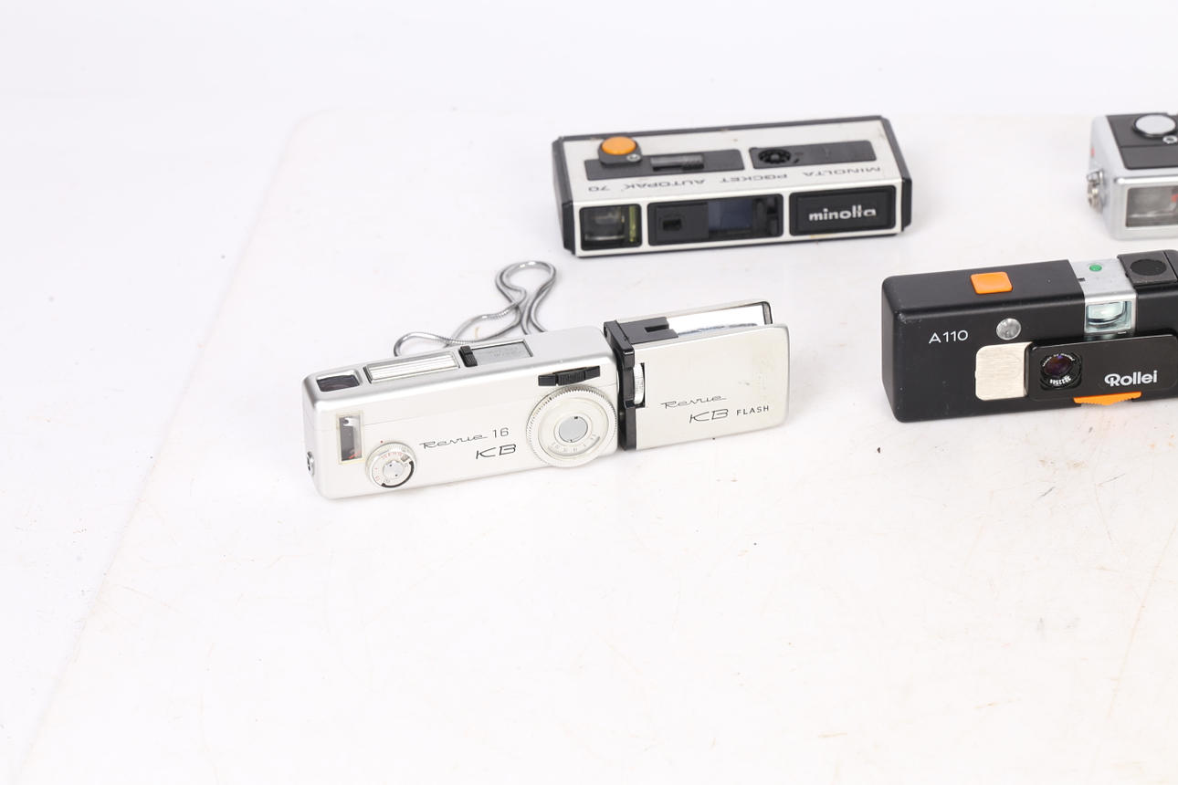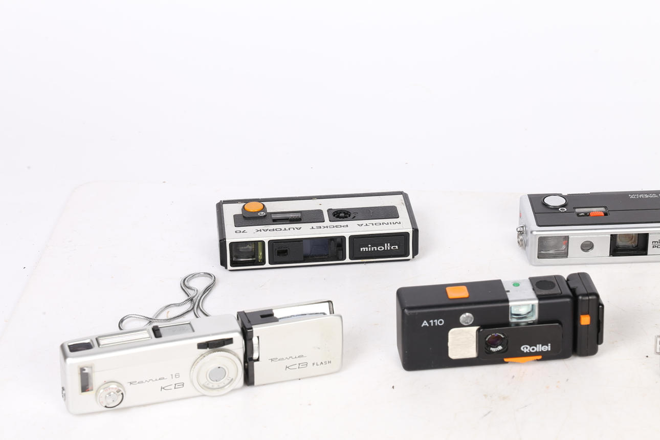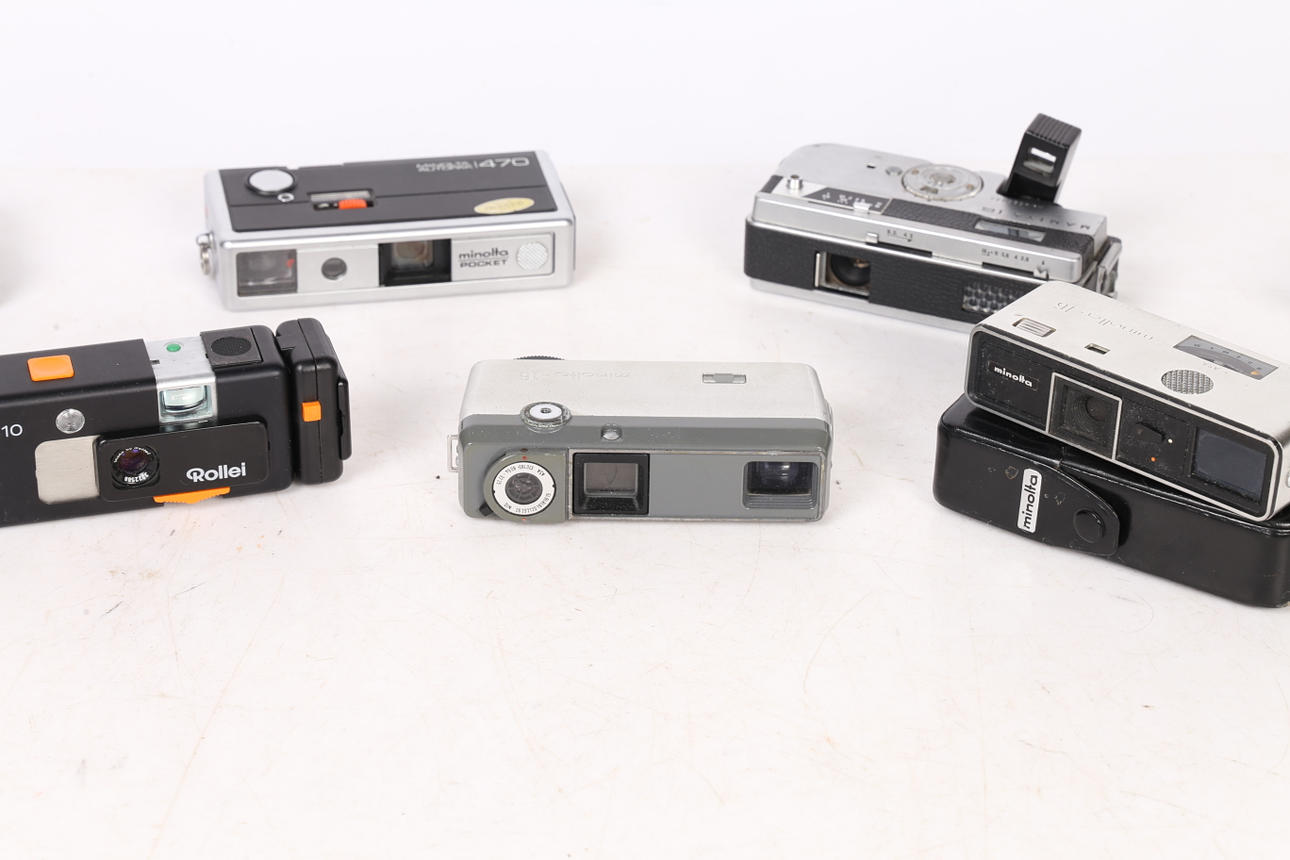 Att inkludera en Mamiya 16, Rollei A110, Revue KB 16 med blixt och en samling Minolta-kameror - 16, 16 EEII, 16QT, Autopak 70 och 470. (8).