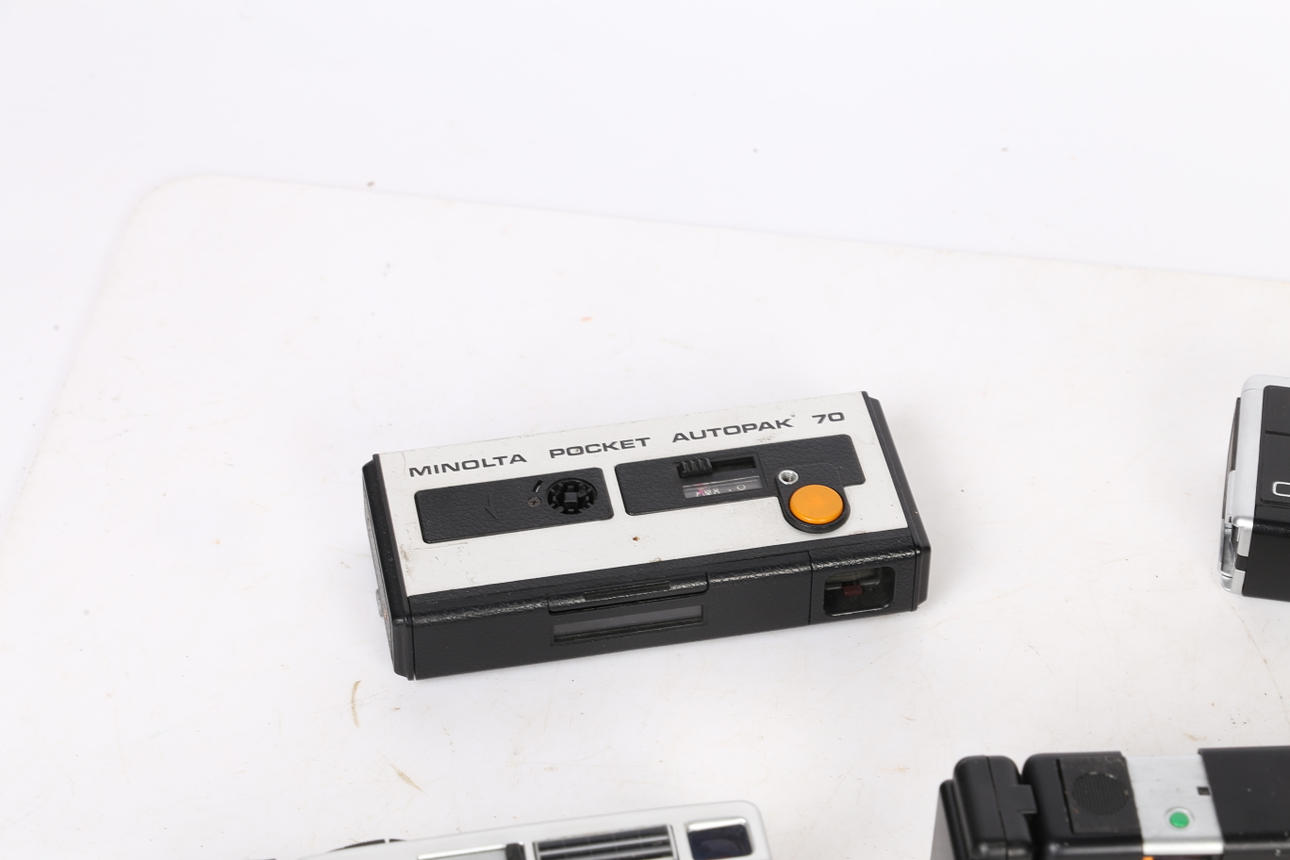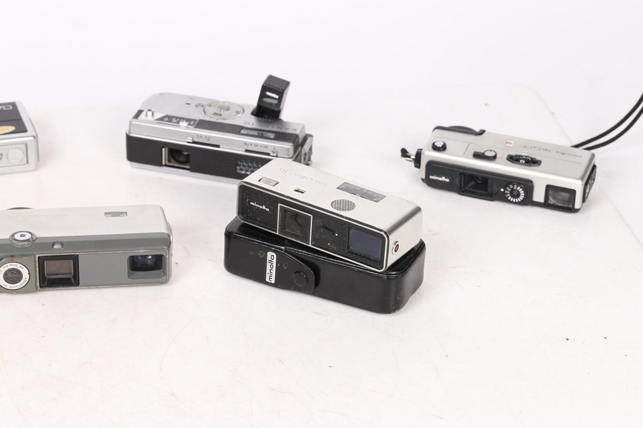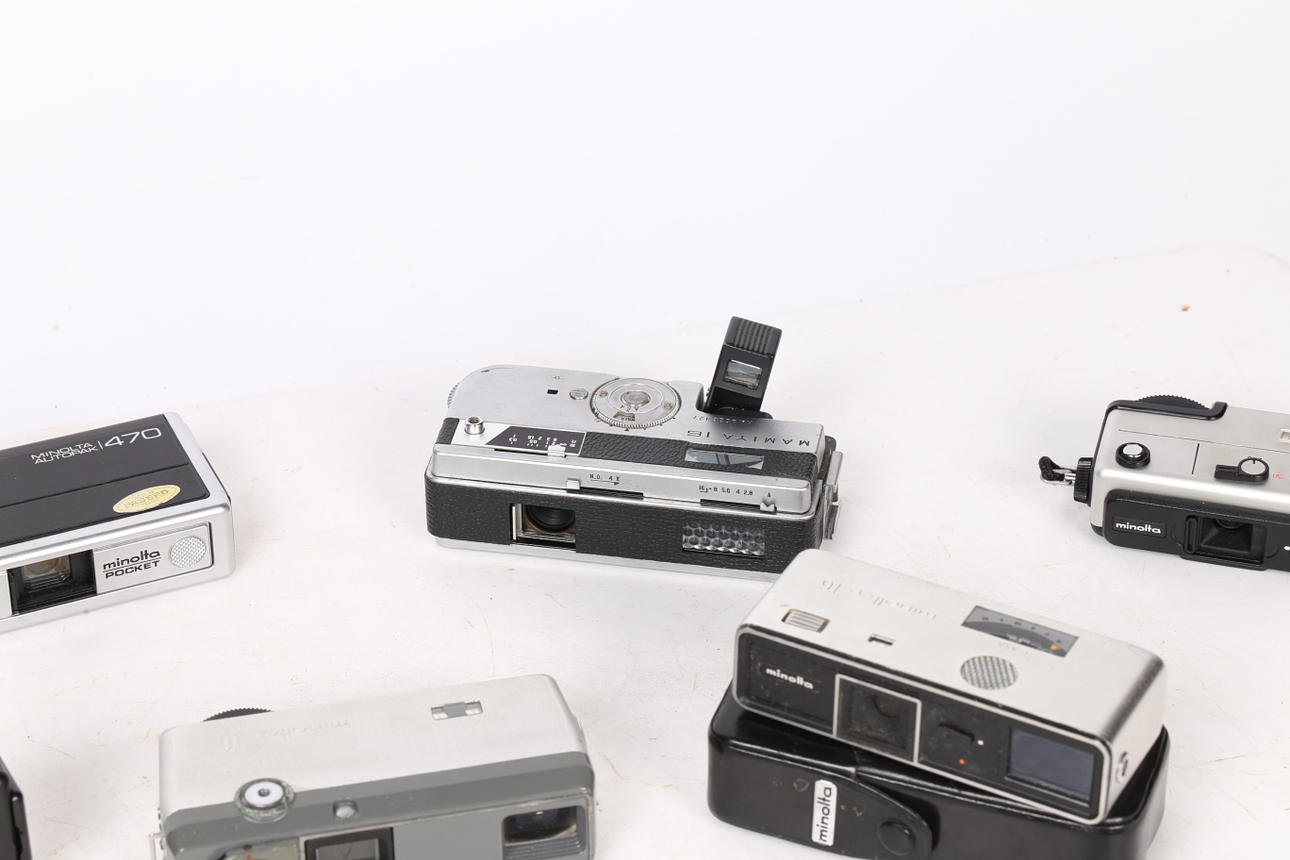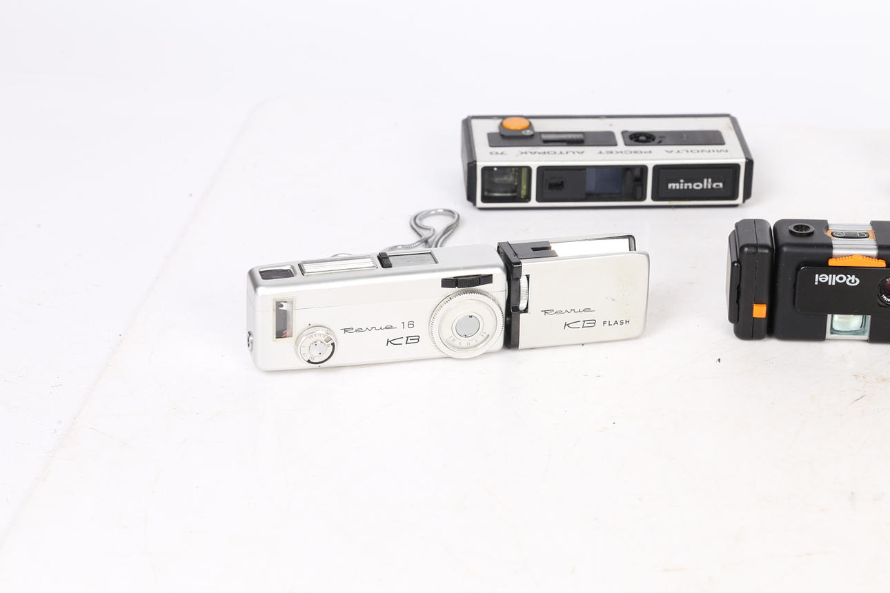 Att inkludera en Mamiya 16, Rollei A110, Revue KB 16 med blixt och en samling Minolta-kameror - 16, 16 EEII, 16QT, Autopak 70 och 470. (8).