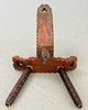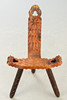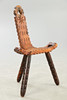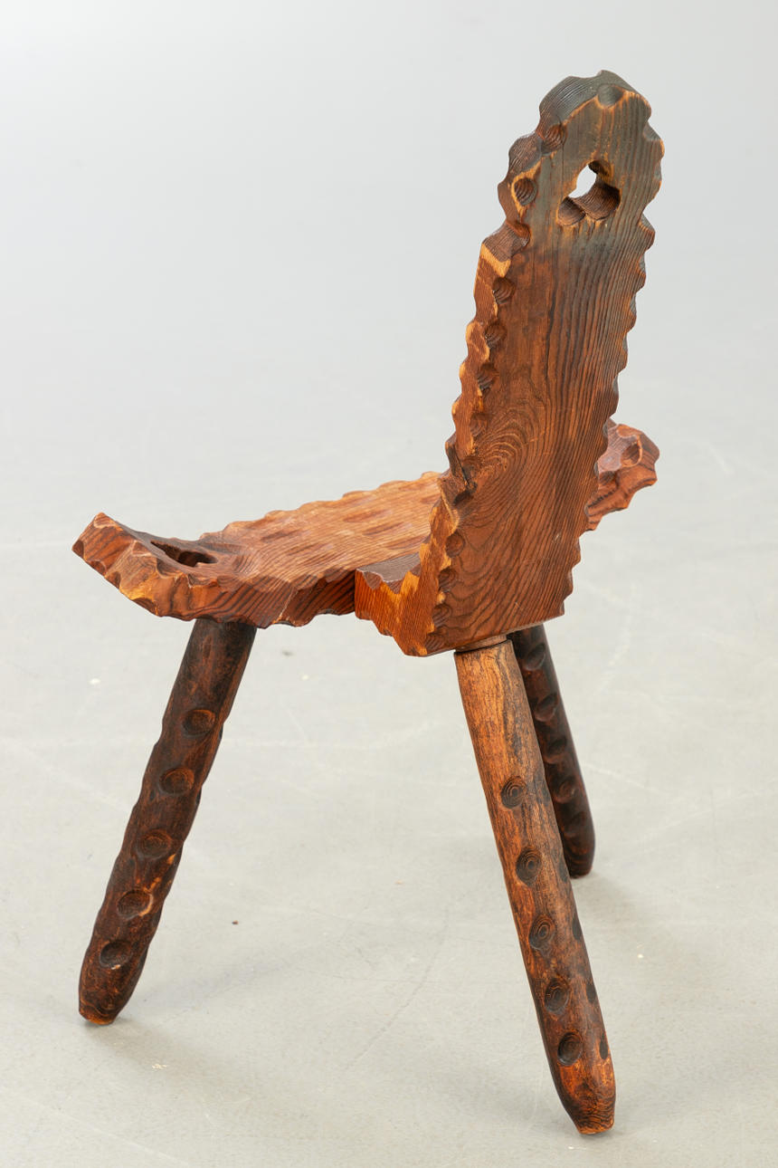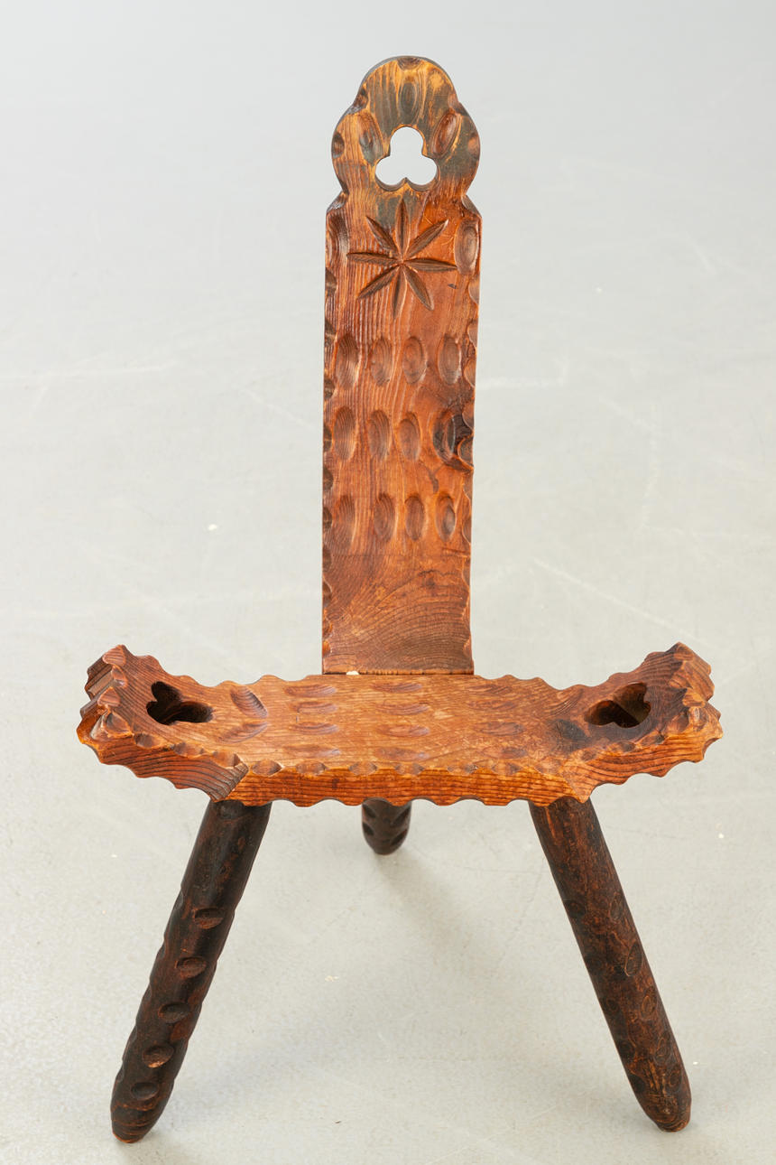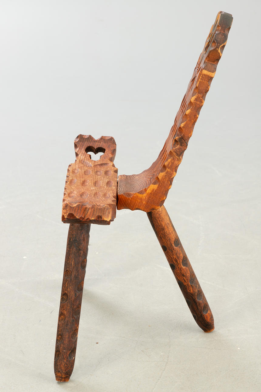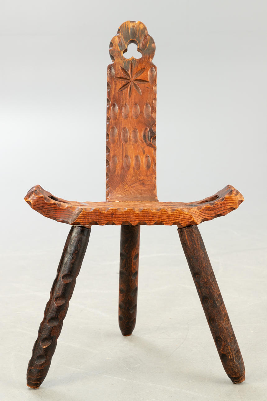 Mörkbrun glaserad trästol med tre ben och höga ryggstöd.
