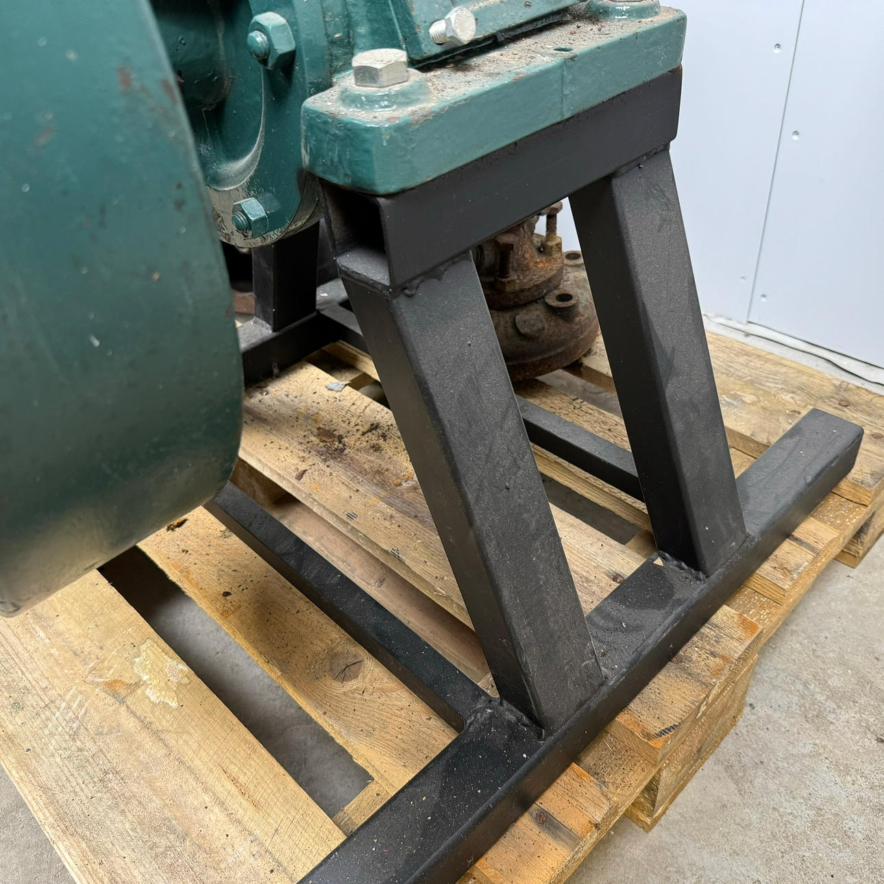 sitter bultad i ett stabilt stålställ