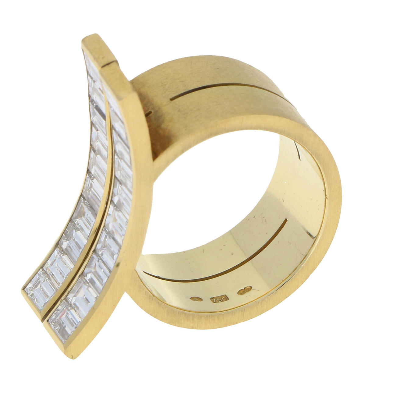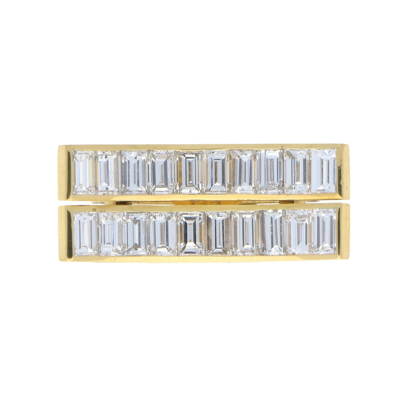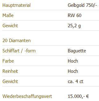 Handgjord med 20 baguetteslipade diamanter av zus. cca 4 ct, gradering hög inkluderar renhet/klarhet: felfri eller VVS 1 & 2 och färggraderna/färg: ultrafin vit eller fin vit, RW 60, vikt. 25,2 g.