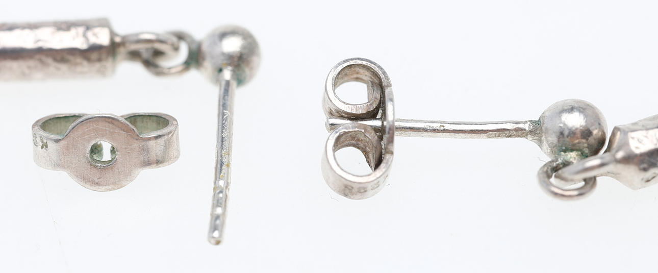 Bakstycke otydligt stämplade, örhängen ostämplade. Positivt syratestade för silver.
