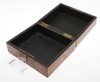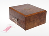 Rotfanér. Metalldekor på askens lock. Längd 20 cm, bredd 17 cm, höjd 10 cm.