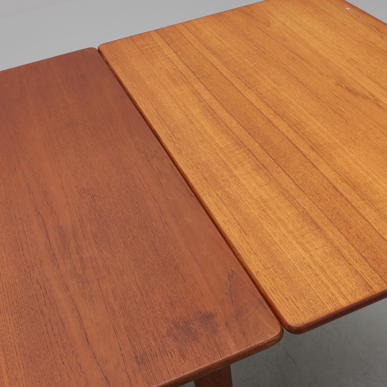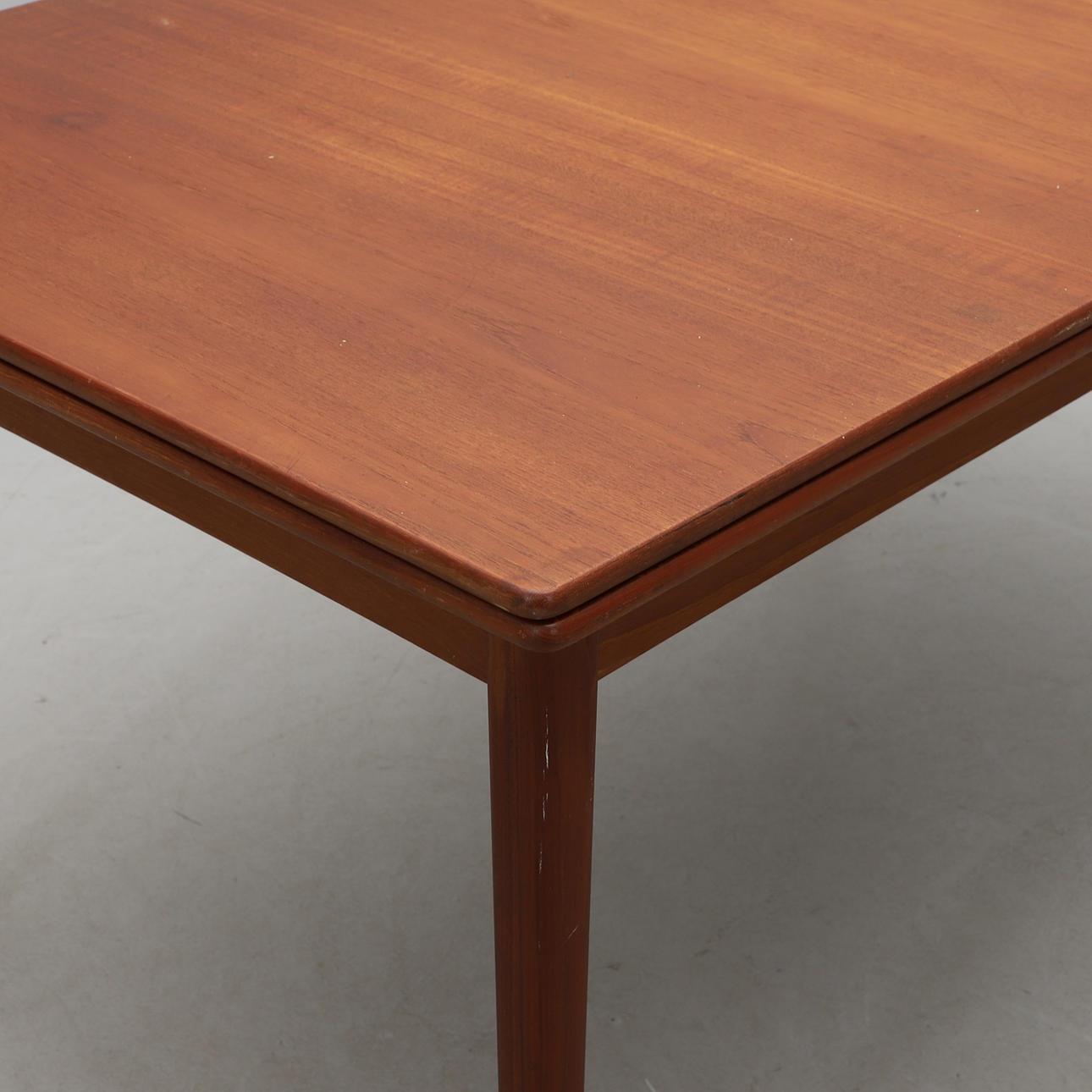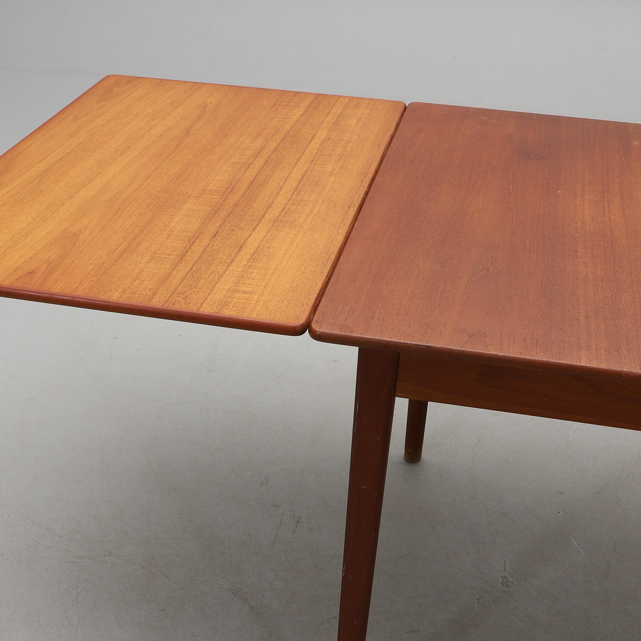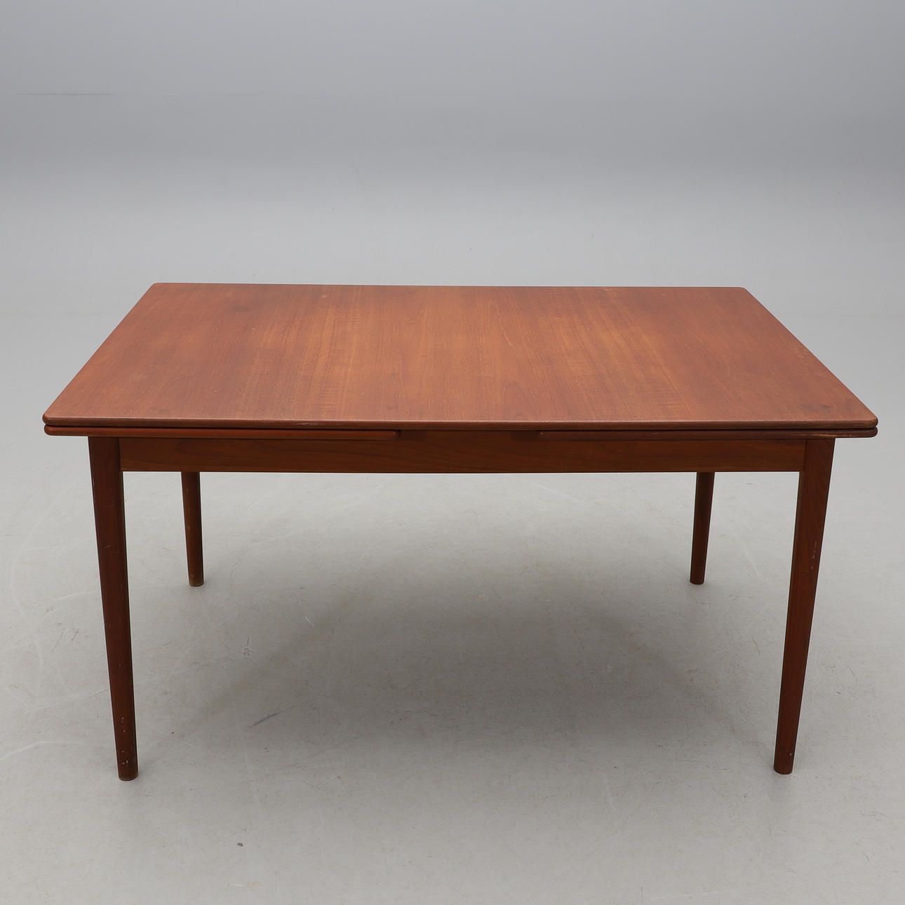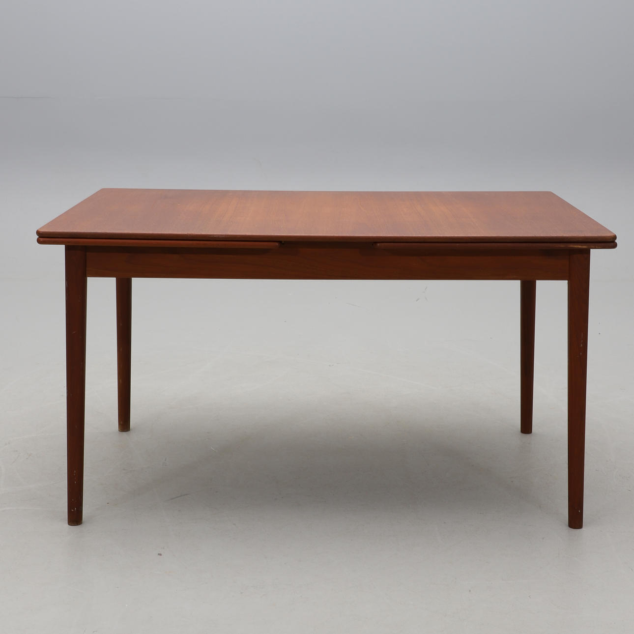 Teak. Holländskt utdrag. Två utdragsskivor á 57 cm. Längd 135 (total längd ca 250), bredd 85, höjd 73 cm.