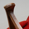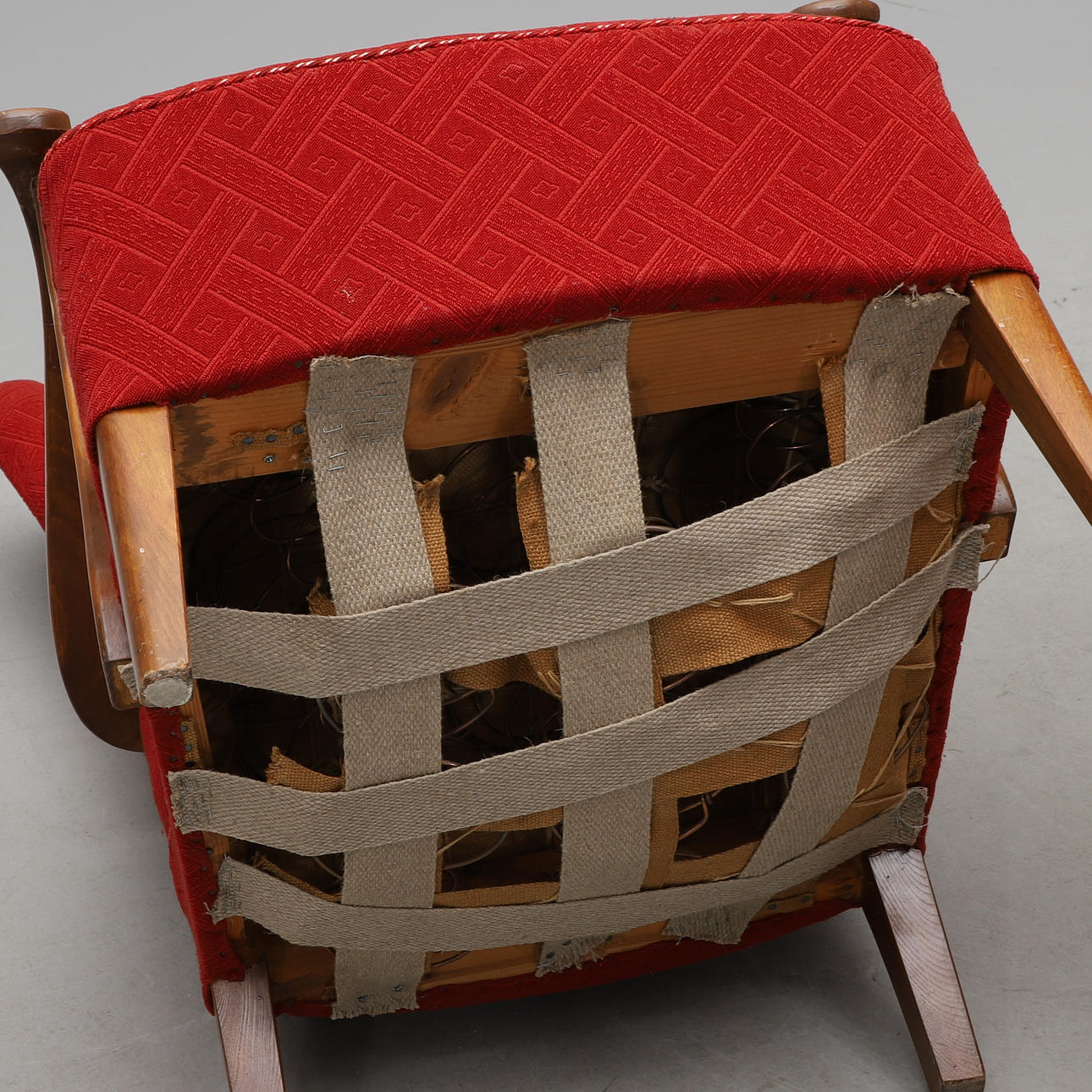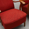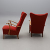 Ben och armlän av bok. Helstoppade textilklädda fåtöljer. Resårsits. Bredd 70, rygghöjd 104, sitthöjd 42 cm.