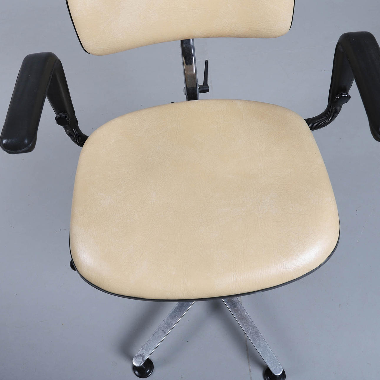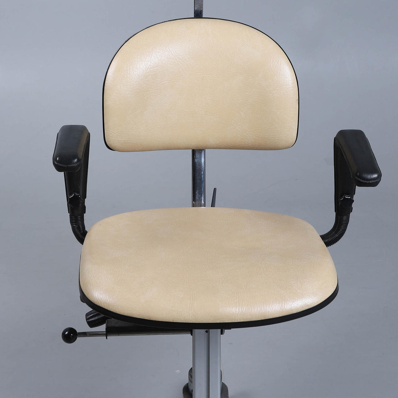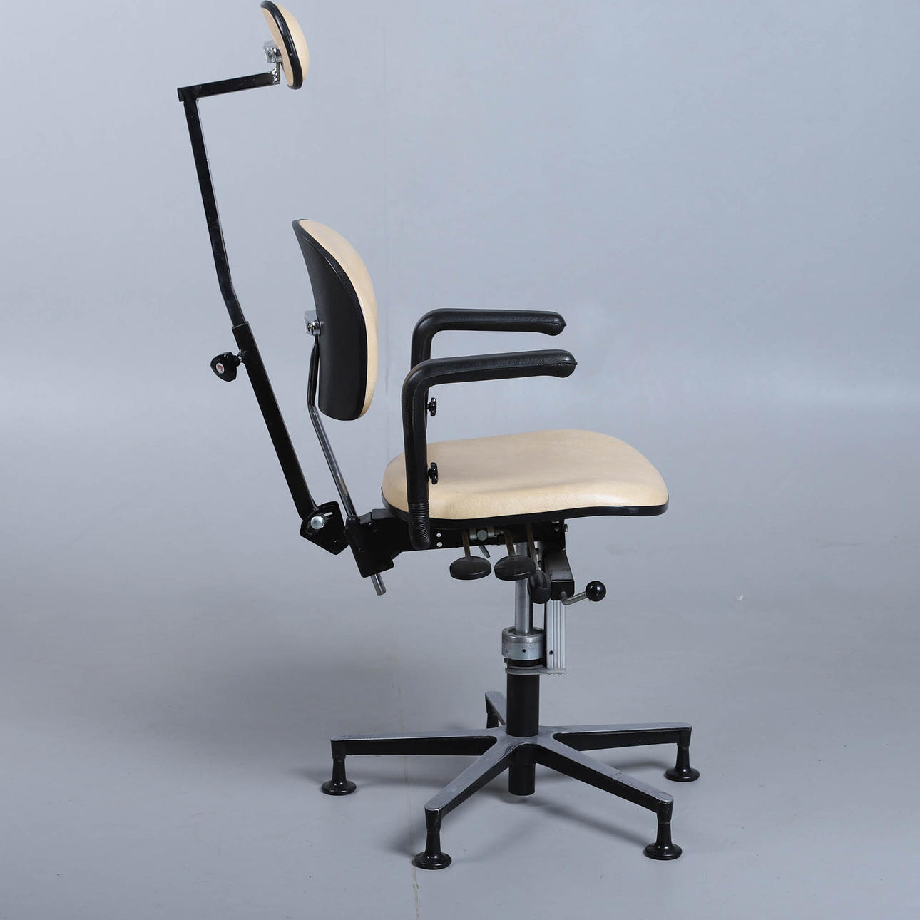 Steglöst inställbar sittvinkel, höj- och sänkbar mellan 43 och 56 cm med hjälp av gaskolv. Sitsen är snurrbar. Höj- och sänkbart huvudstöd.