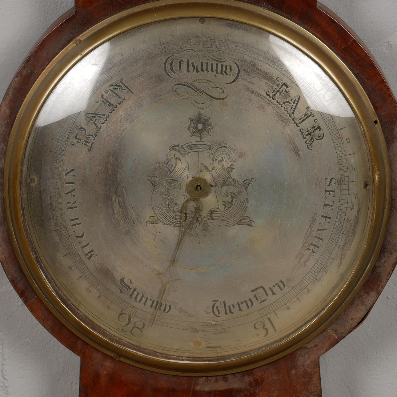 Fodral fanerad i mahogny med tavla i tenn. Nederdel med vattenpass. Höjd 107 cm.