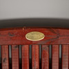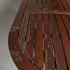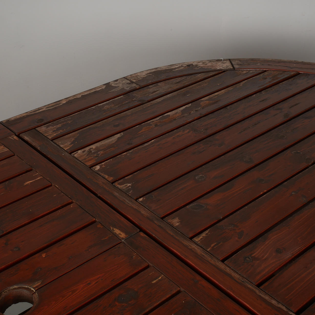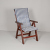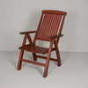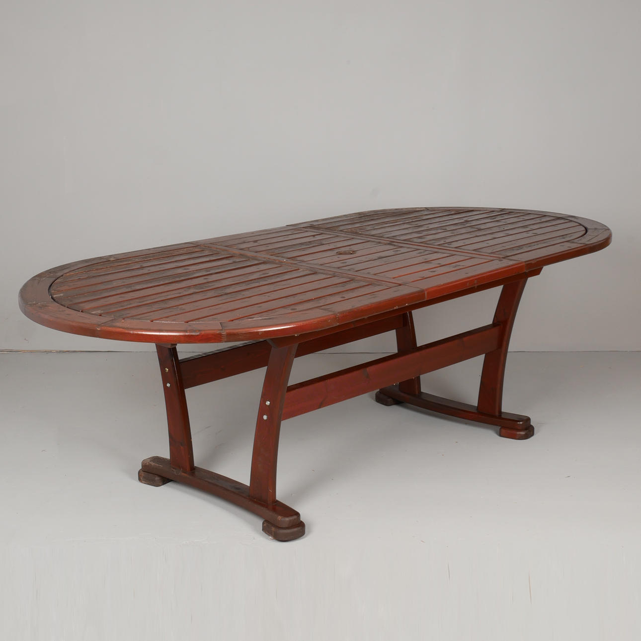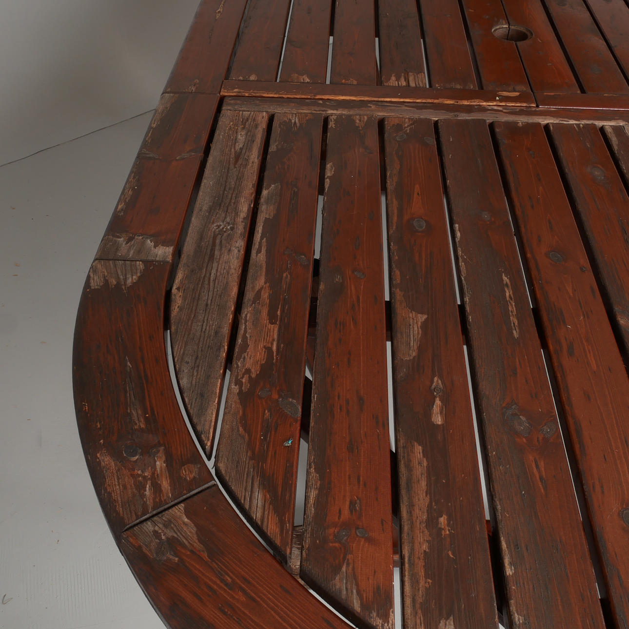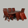 Bord med iläggsskiva. Skiva 110x235 inklusive iläggsskiva 50 cm. Höjd 74 cm. Iläggsskiva (under skiva) med hål för parasoll. 8 fällbara positionsfåtöljer med dynor.