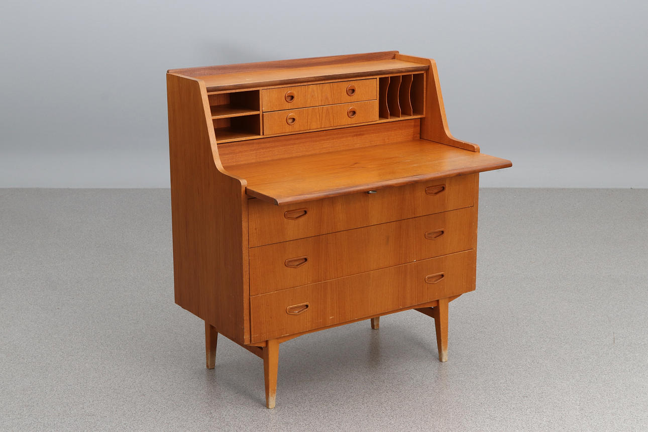 Utdragbar skrivskiva. Höjd ca 99 cm. Bredd ca 88 cm. Djup ca 46 cm.