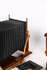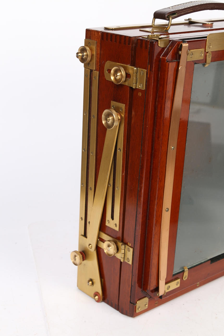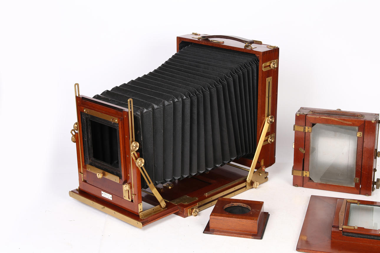 Gandolfi, halvplatta kamera från 1900-talets mitt med mahognykonstruktion och svart läderbälg, tillsammans med en Thornton Pickard Triple ”Imperial” Extension. (2).