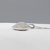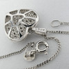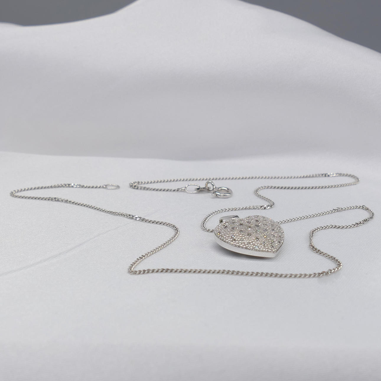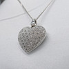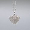Hänget mäter 17 x 15 mm och har en filigran hjärtdesign på baksidan. Den hänger på en 42 cm kantlänk kedja utrustad med ett bultringlås.