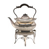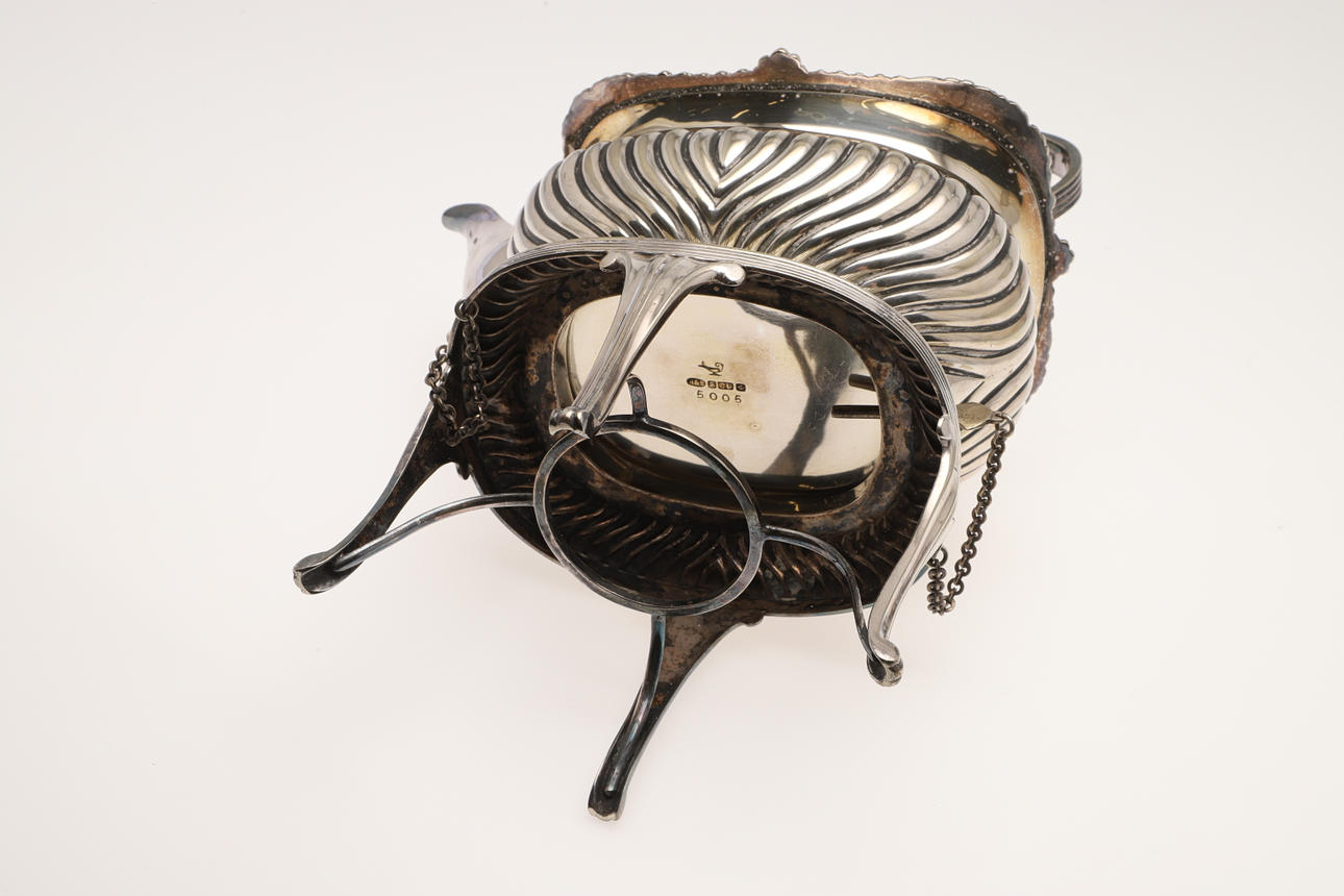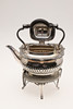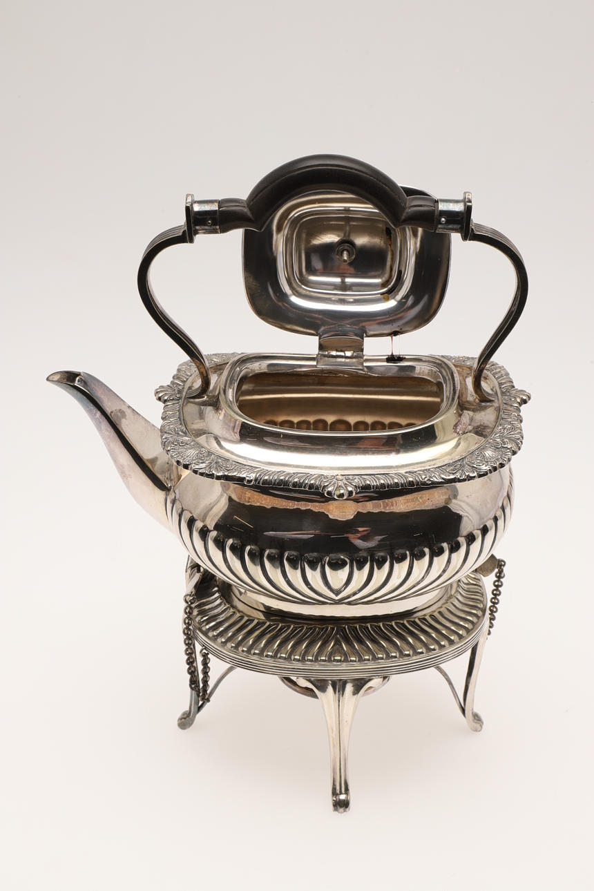 rundad rektangulär form, med kantband och skal, räfflad underdel och rullhandtag, saknar brännare; 11,75 tum (30 cm) hög.