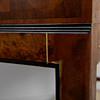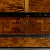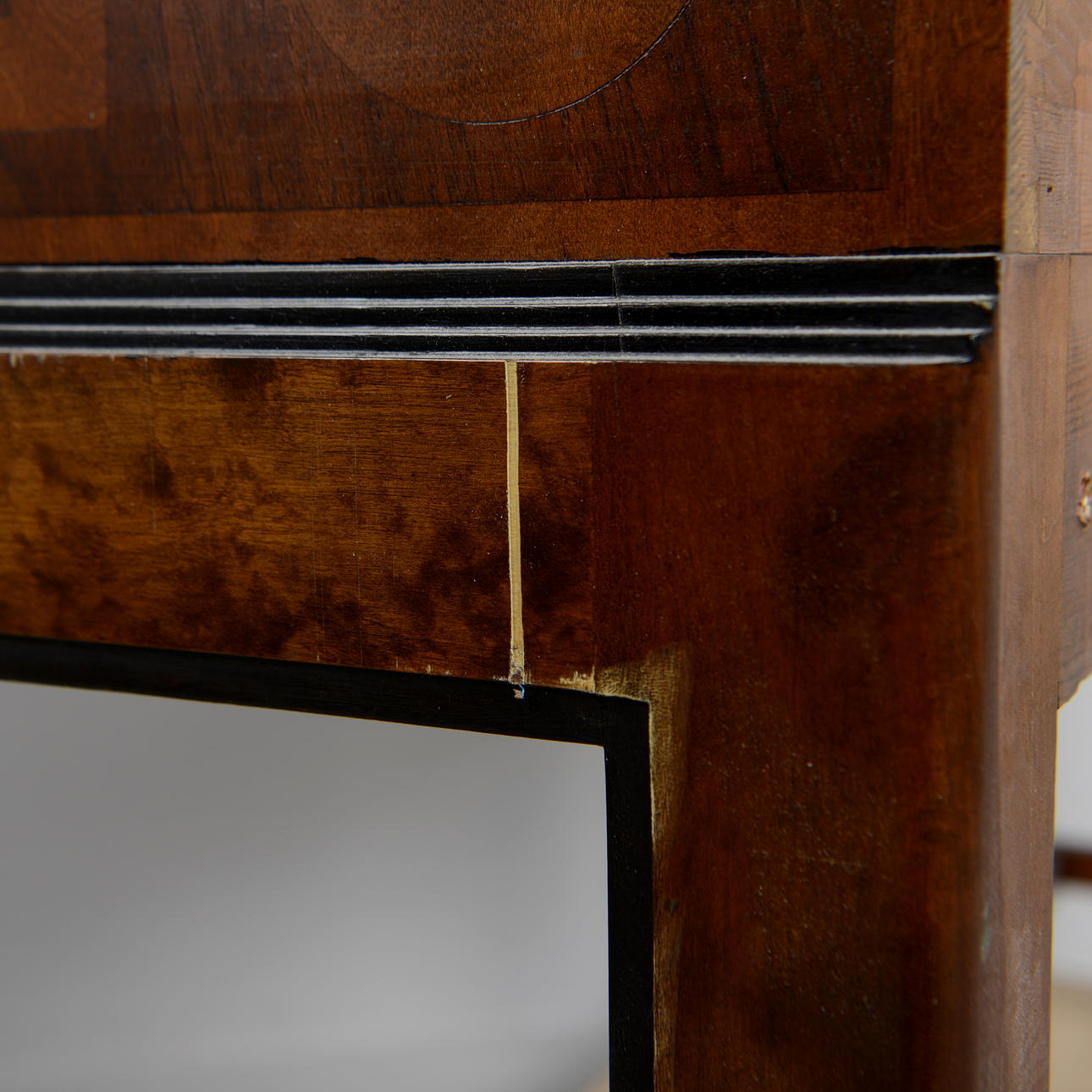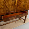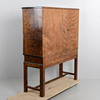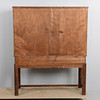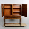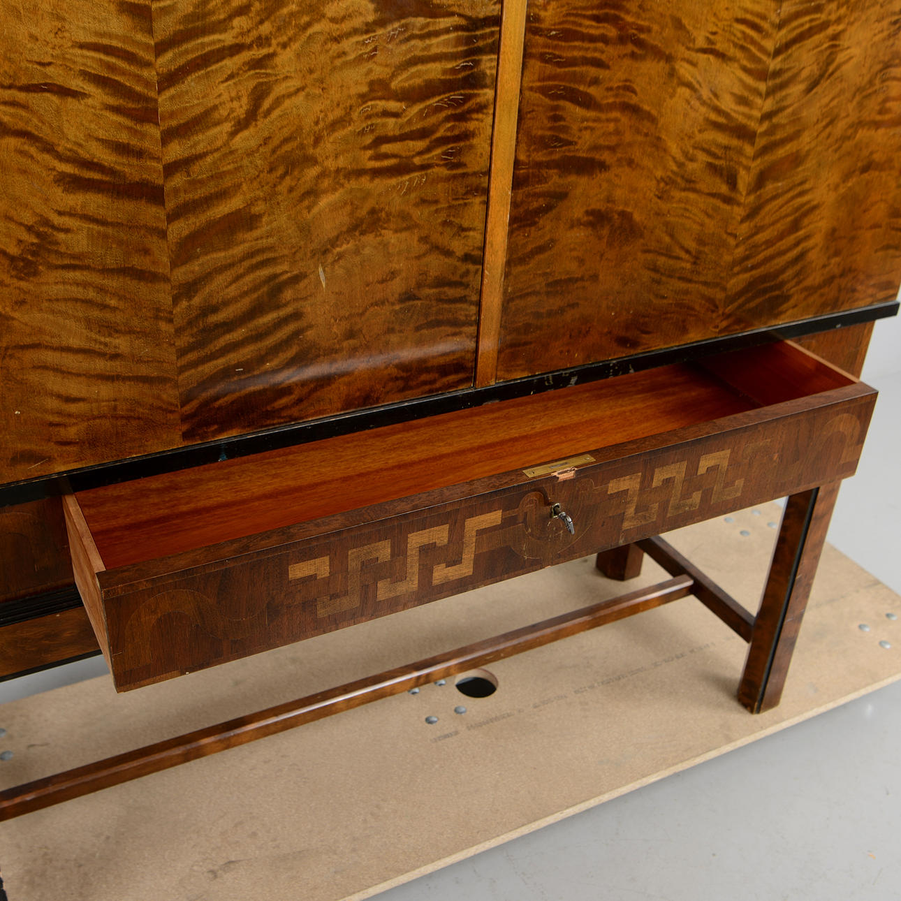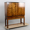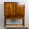 Skåp i bonat björk med dörrpar med bakomliggande inredning samt lådor. Längd 129 cm. Djup 47 cm. Höjd.