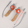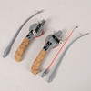 Bruksslitage, ytsmuts, mindre avslag på handtagen. Handtaget på det ena pimpelspöet en lagning. Det andra pimpelspöet är aningen trögvevat.