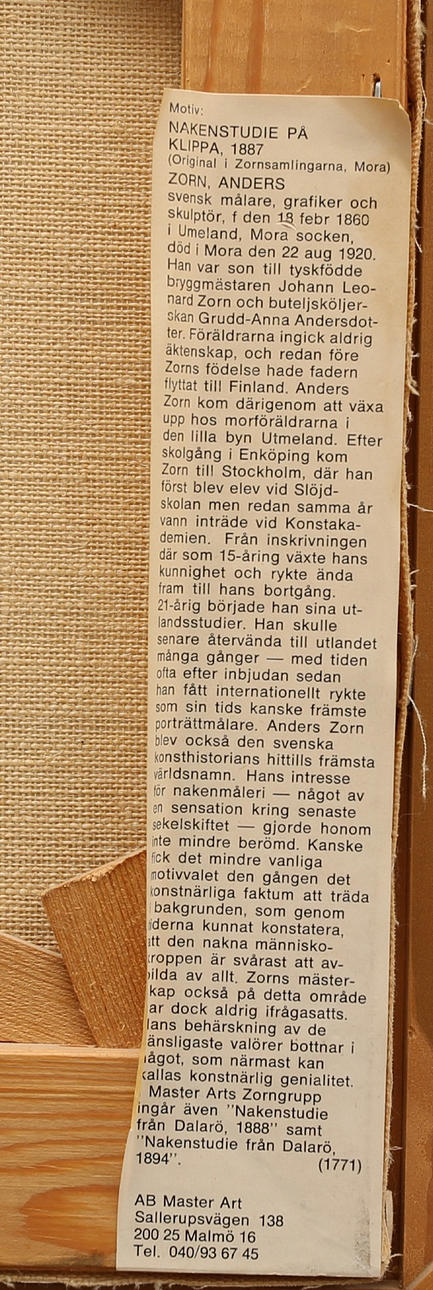 3637450. ANDERS ZORN efter, tryck, nakenstudie på klippa, Master Art Malmö.