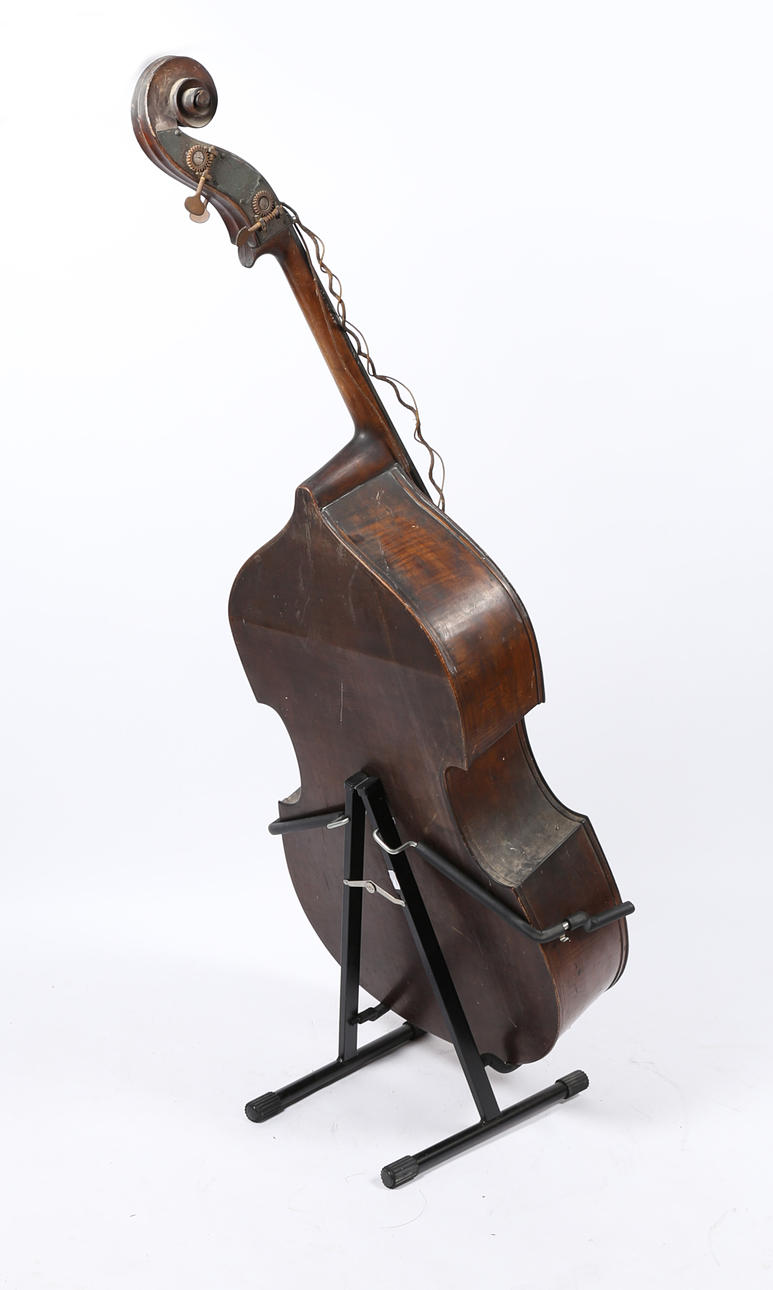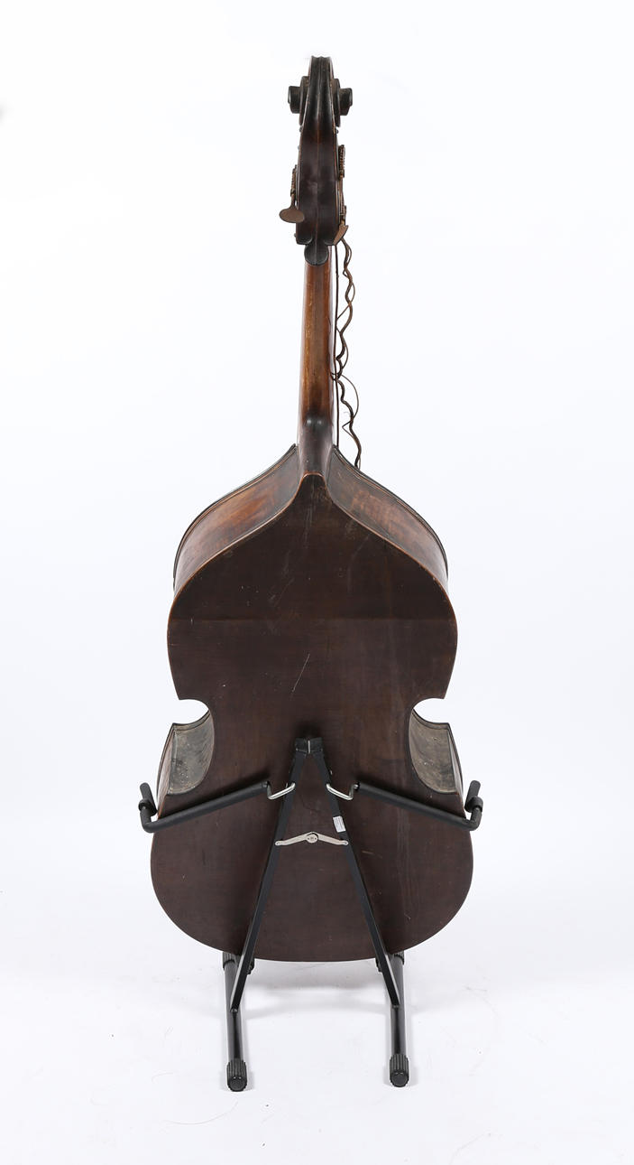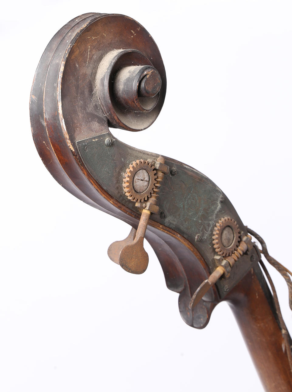 Den omärkta kontrabasen, 189 cm höjd, med blommig graverad metallplatta på sidorna av pinnbrädan och en snidad rulle, tillsammans med en rosett, båda AF.