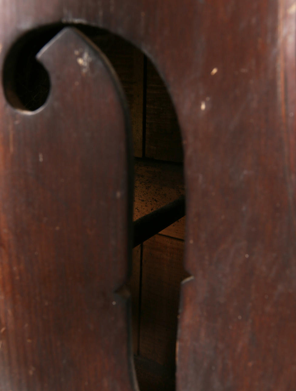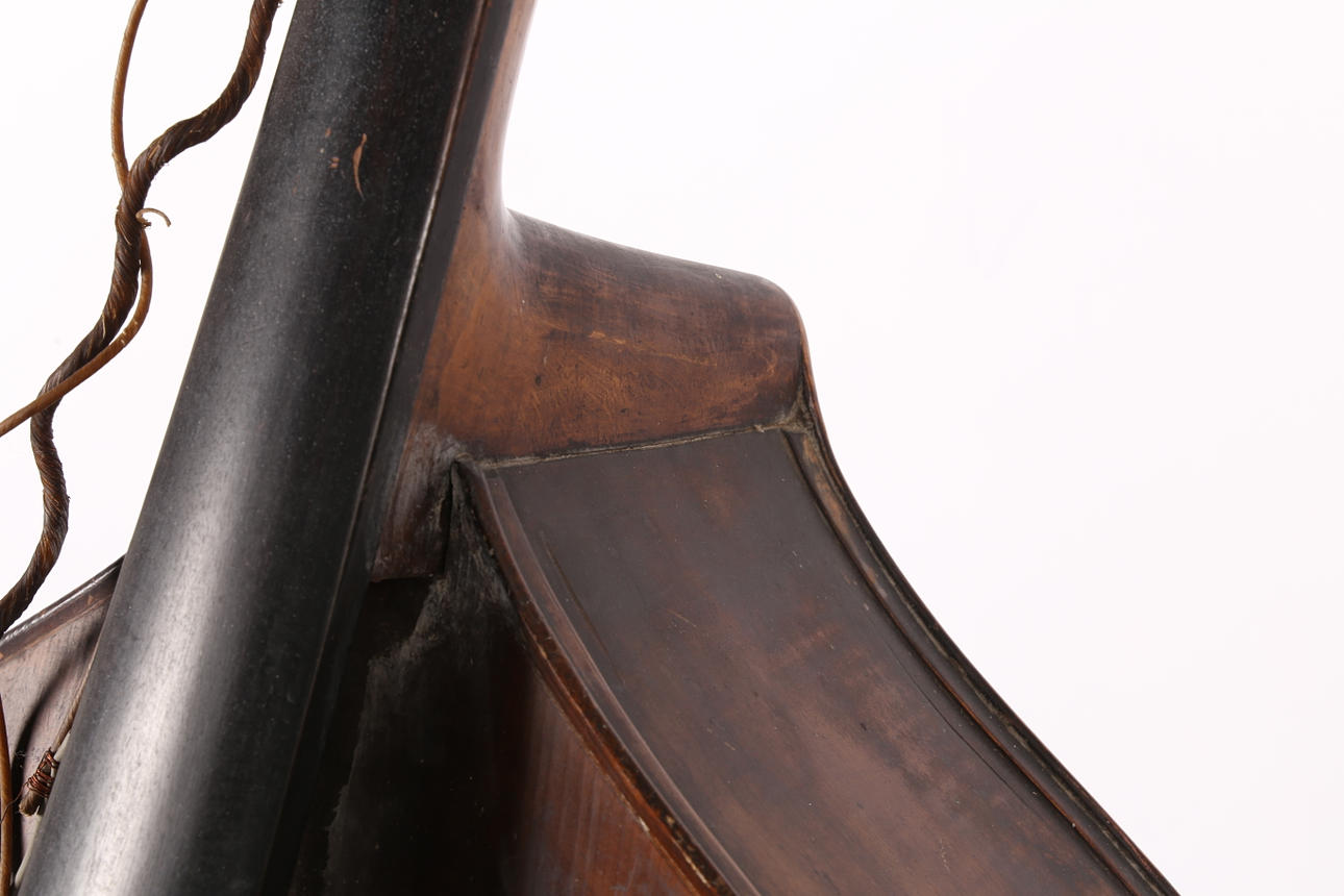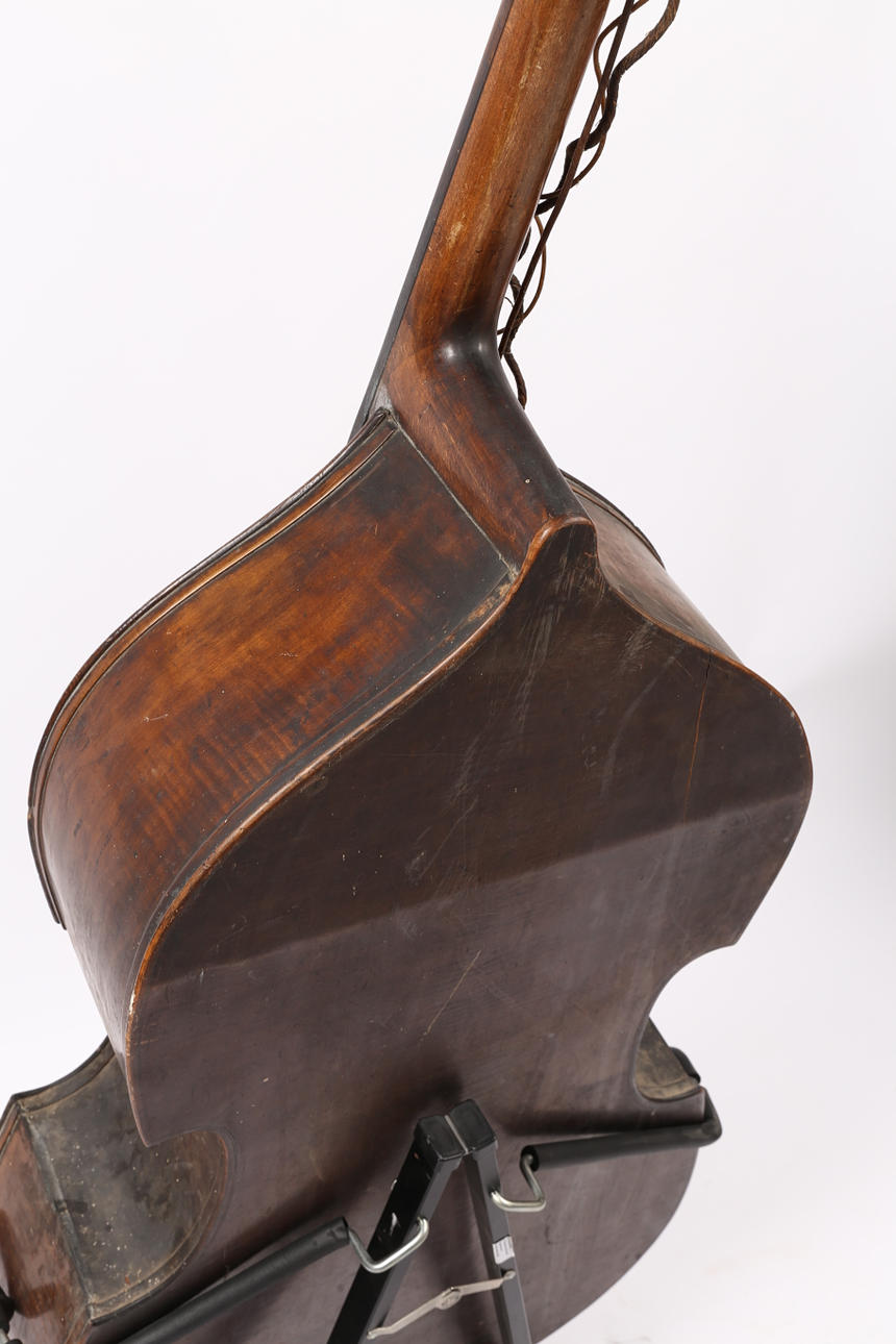 Den omärkta kontrabasen, 189 cm höjd, med blommig graverad metallplatta på sidorna av pinnbrädan och en snidad rulle, tillsammans med en rosett, båda AF.