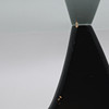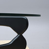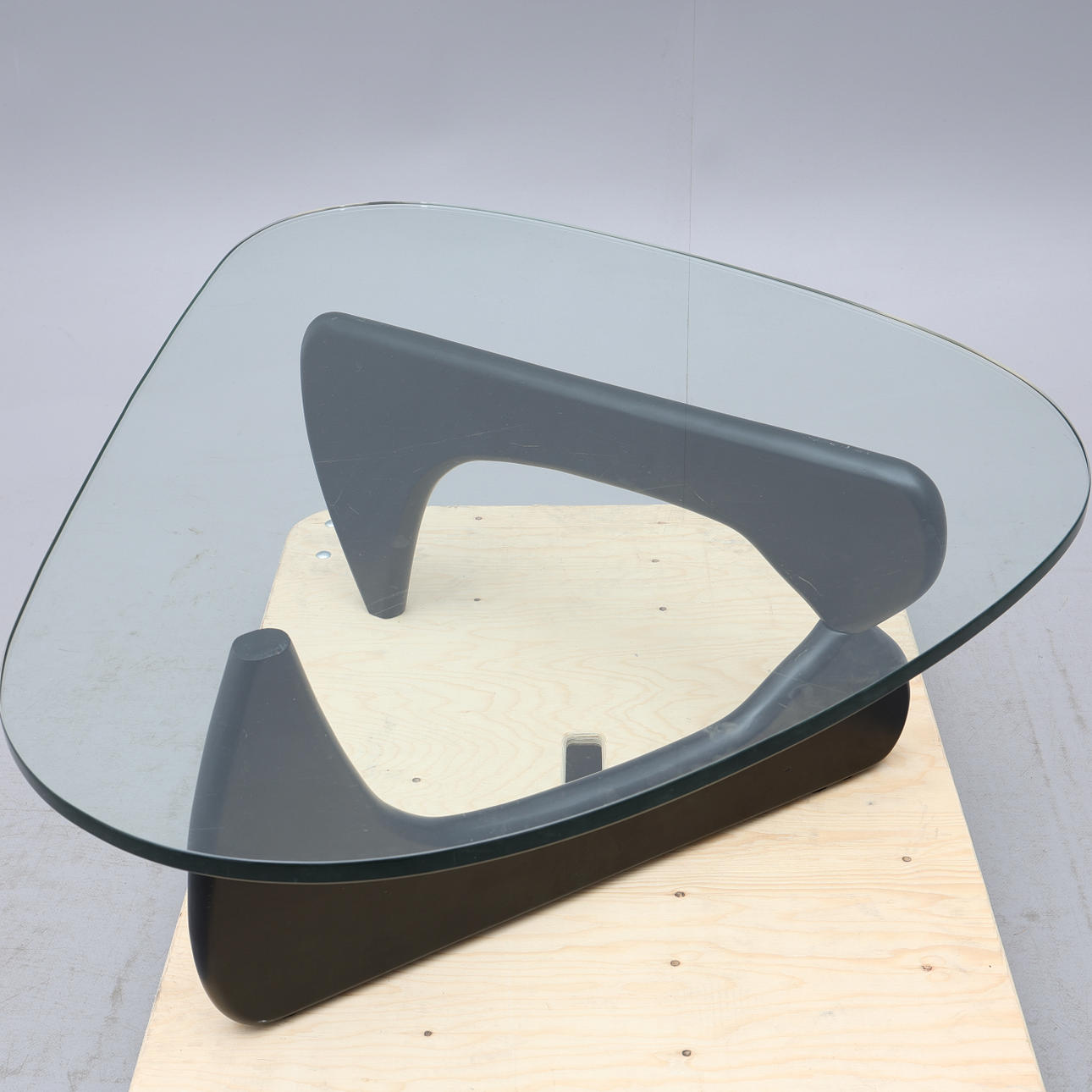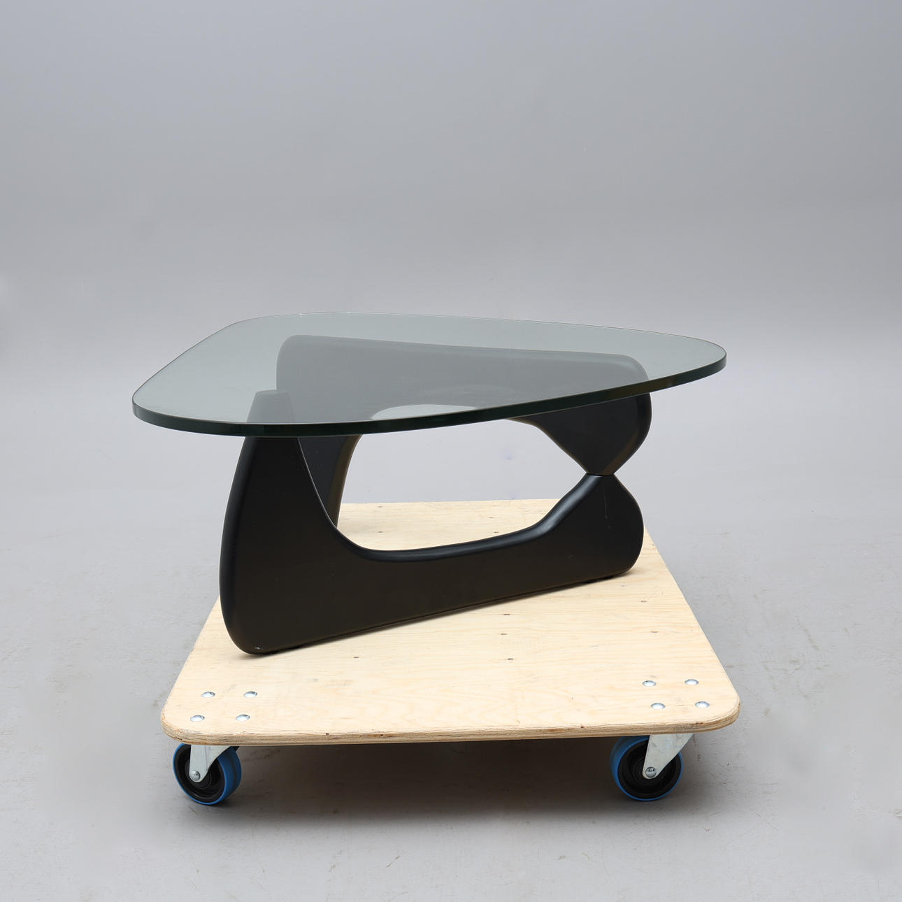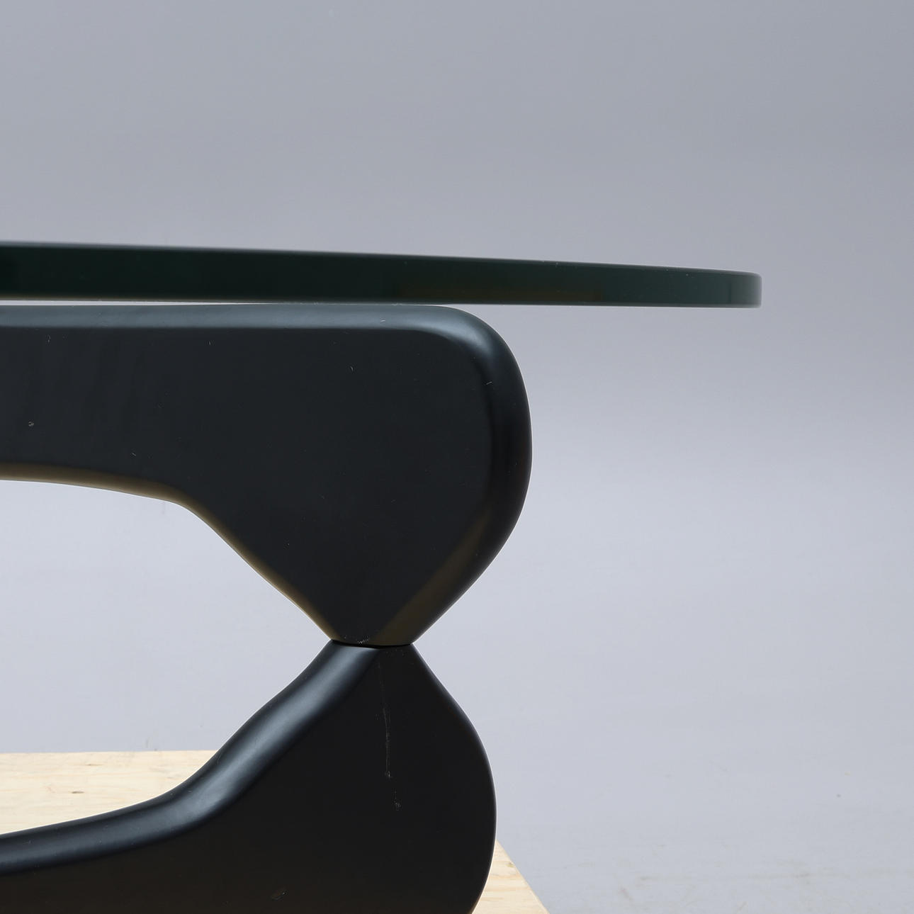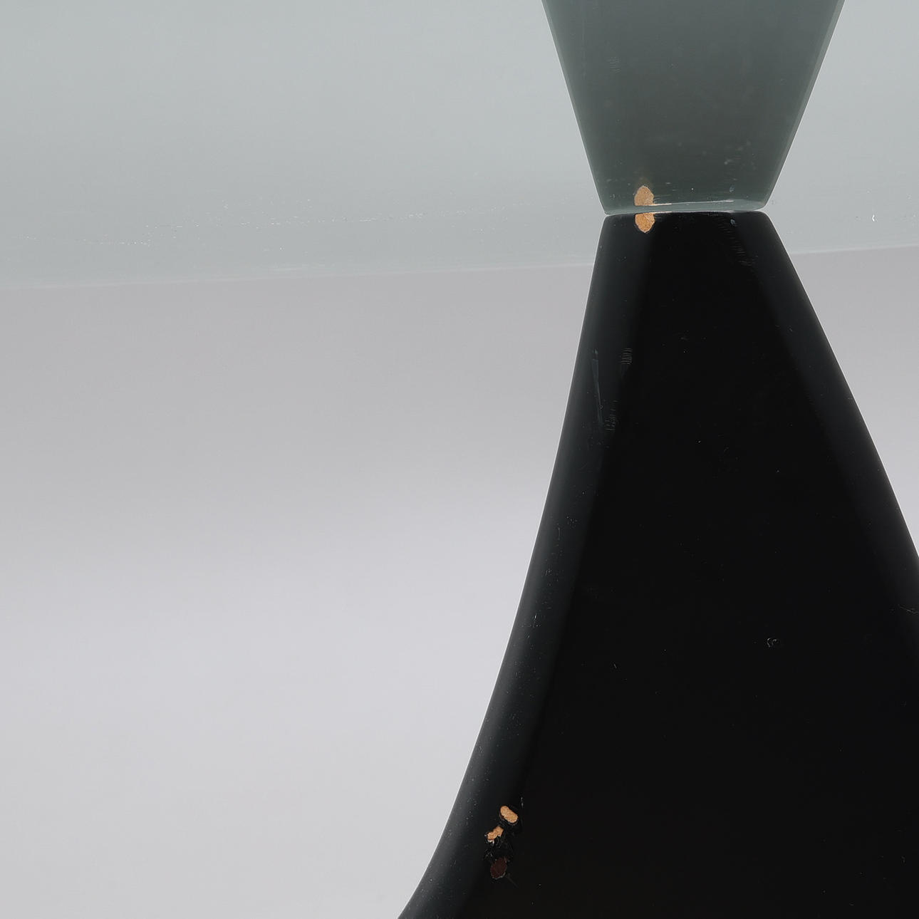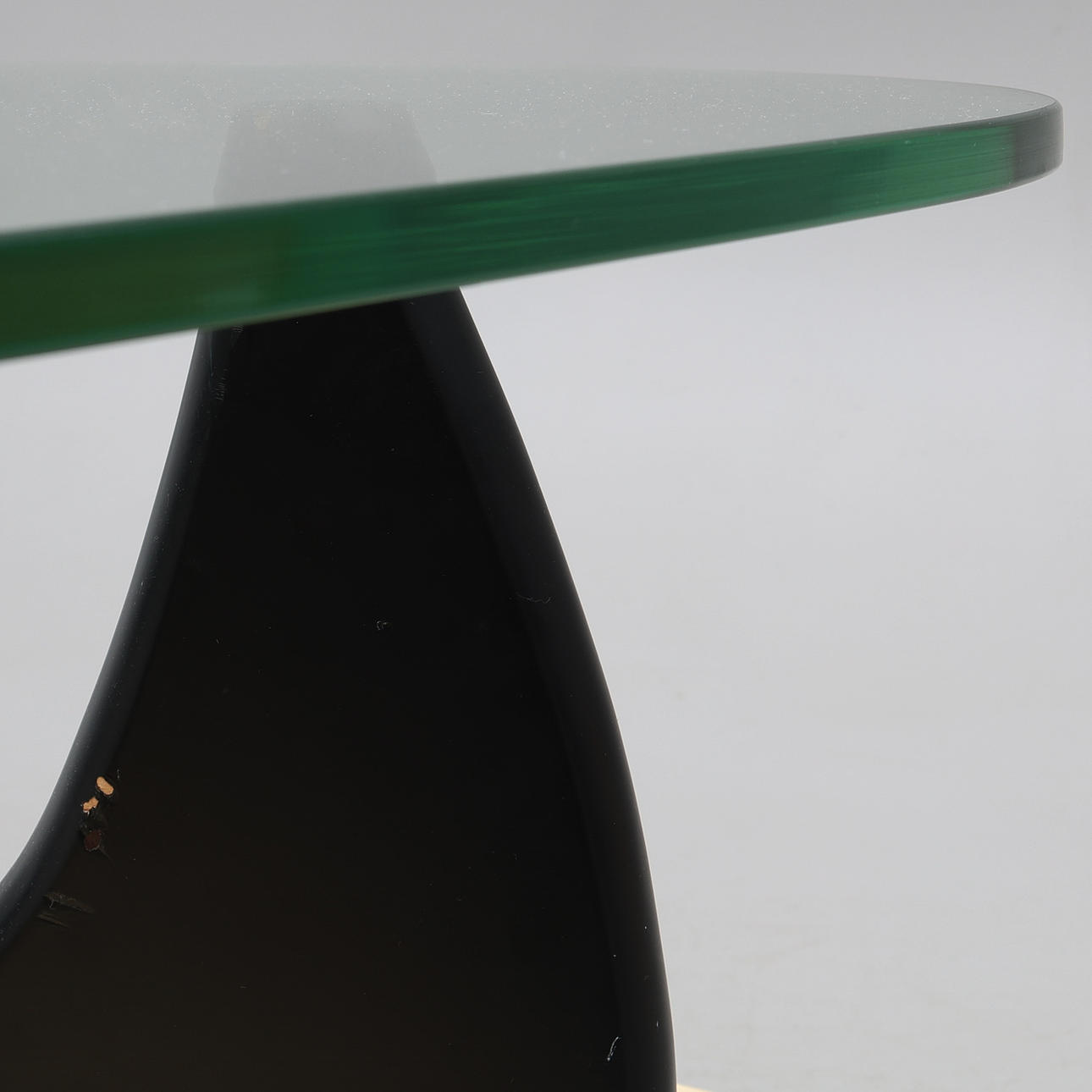 Lös njurformad glasskiva på tvådelat underrede i svartlackerad ask.