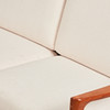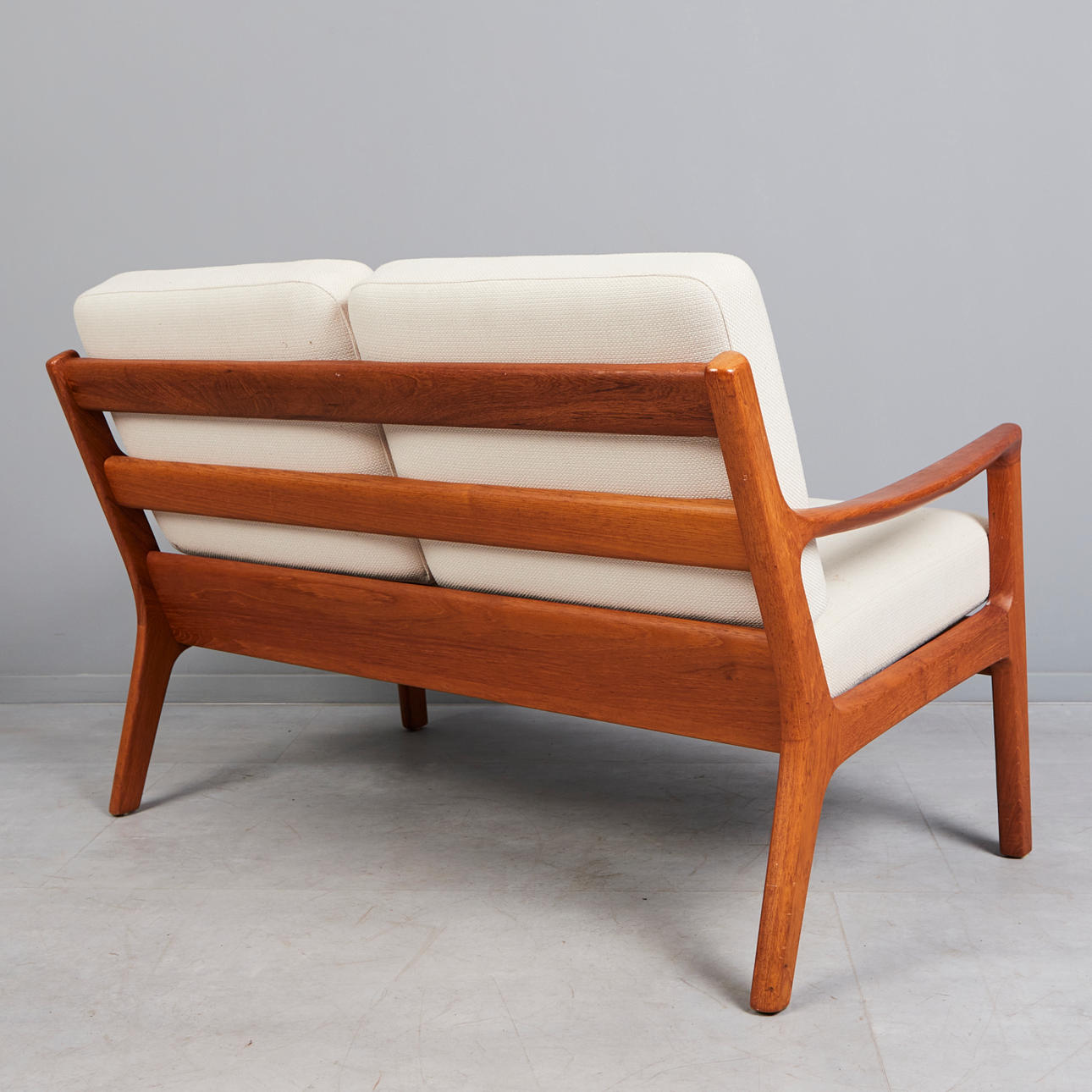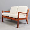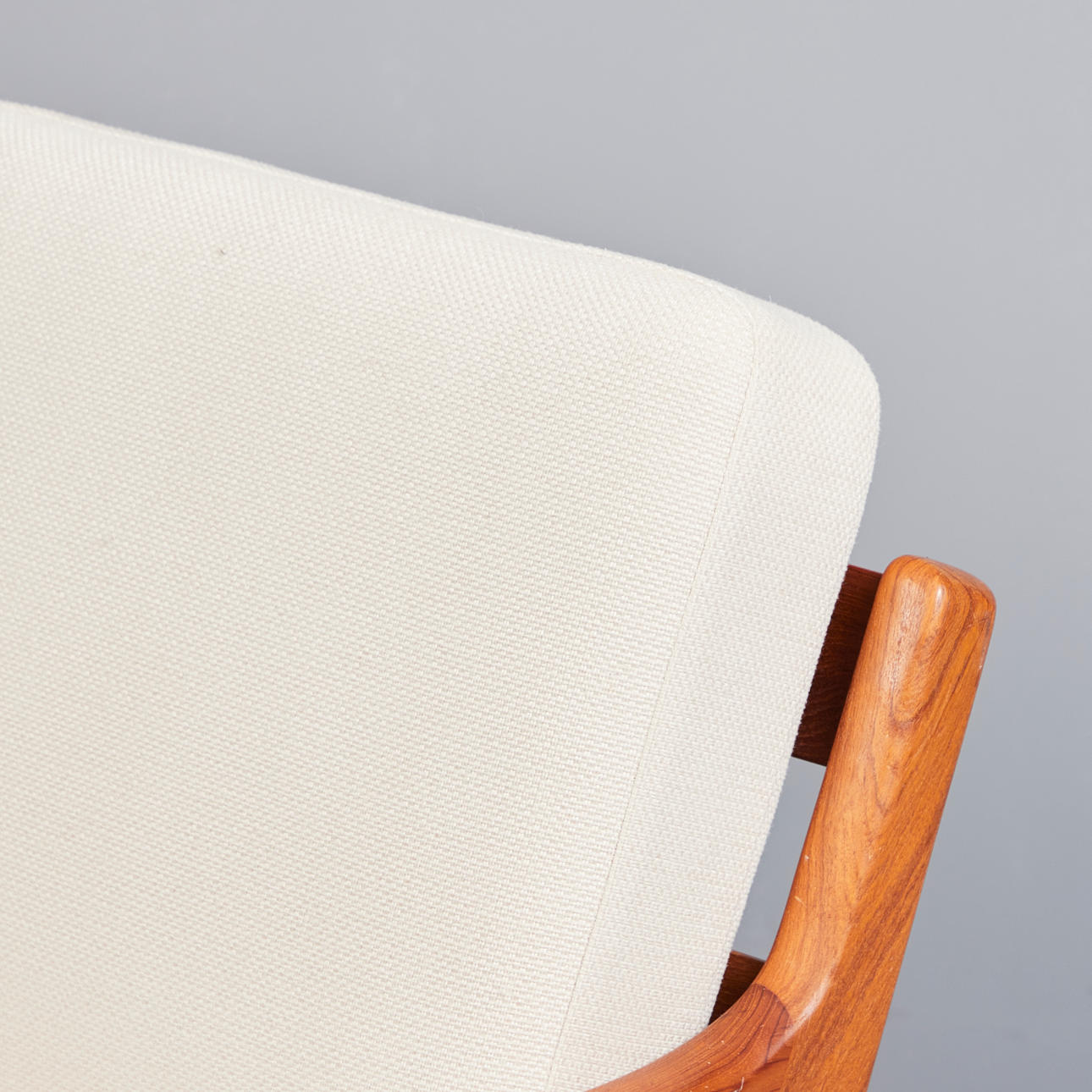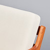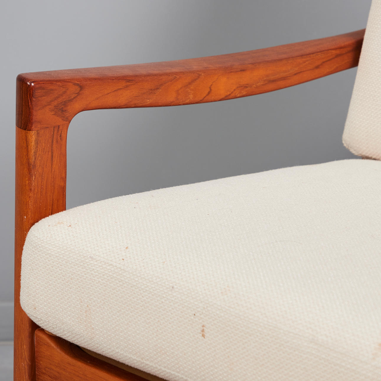 Konstruktion med glaserad teakram med armstöd och löst placerad sits och ryggklädsel av vitt ulltyg, h.80cm, sitshöjd: 47cm, B125cm, D.65cm.