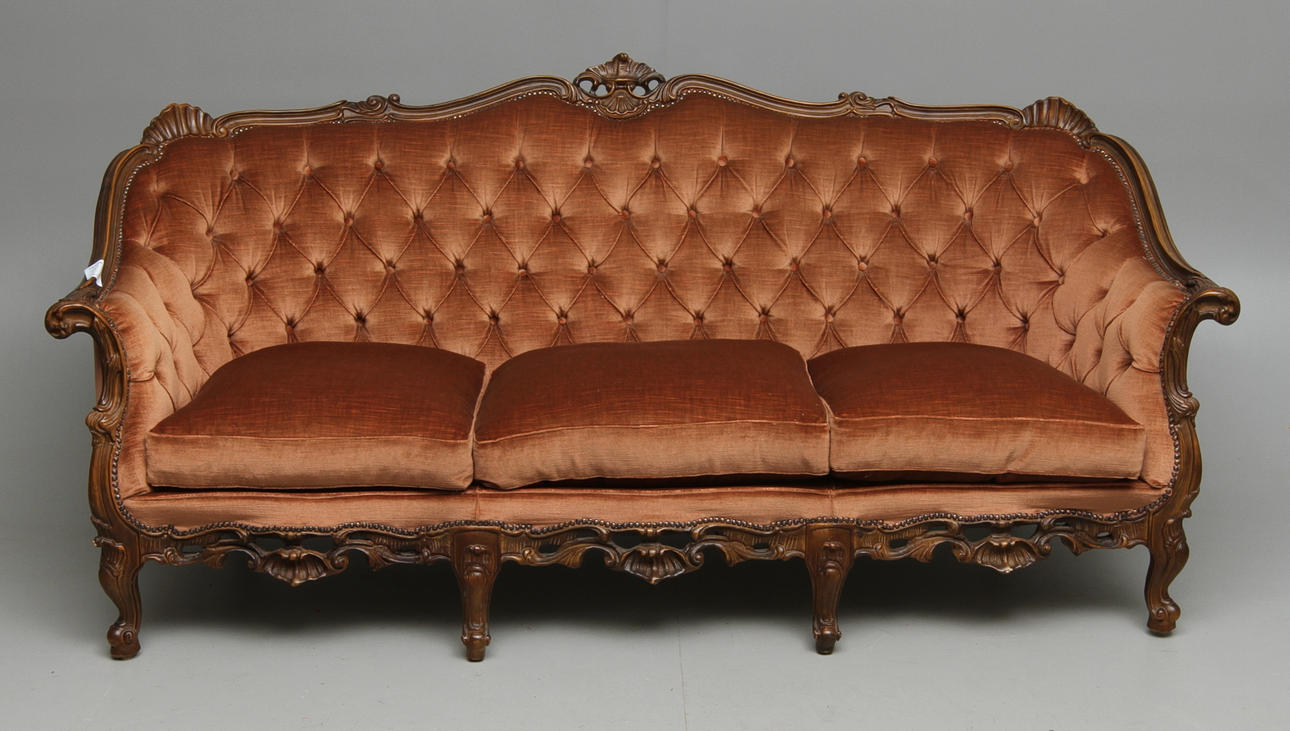 Skuren dekor, djuphäftad rygg. Soffans längd ca 197 cm.