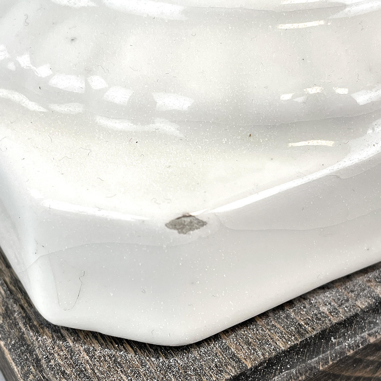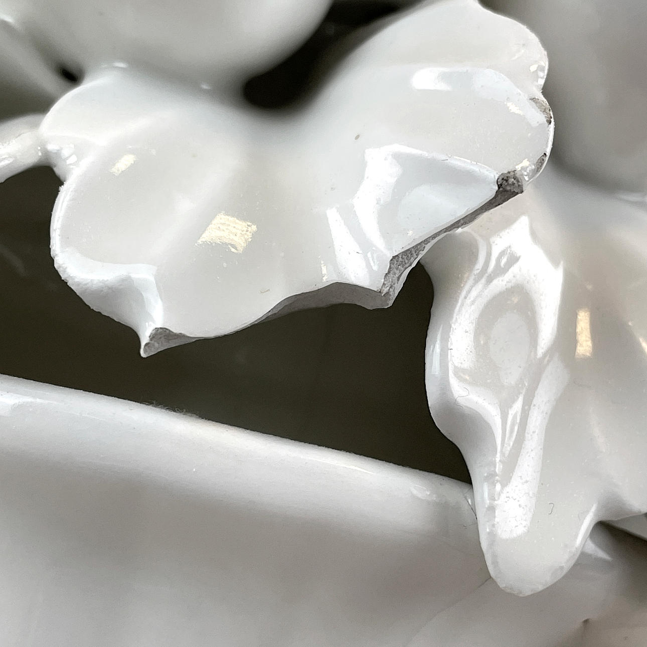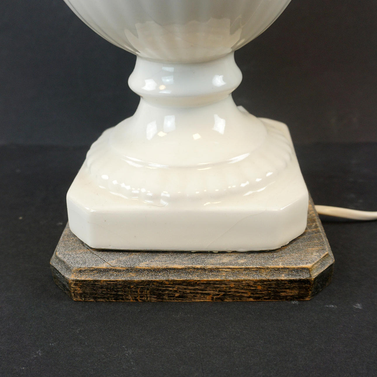 Bruksslitage. Blad med naggar/avslag förekommer. Sockel med glasyrsprickor och ett mindre nagg. Fungerade vid katalogiseringstillfället. Ingen funktionsgaranti lämnas.