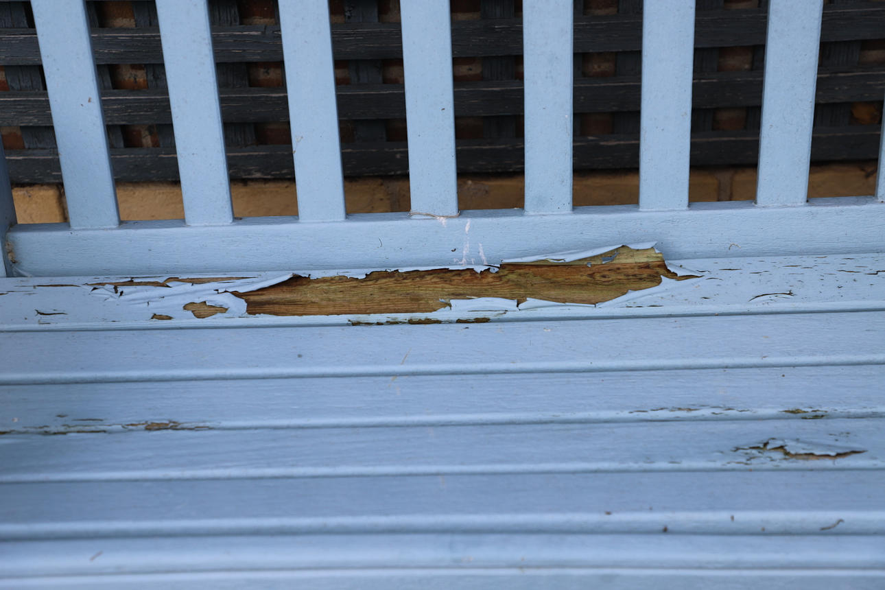 Vittrat skick, färg sprucken och skalande på platser och med mindre graffiti. Se bilder online.