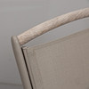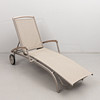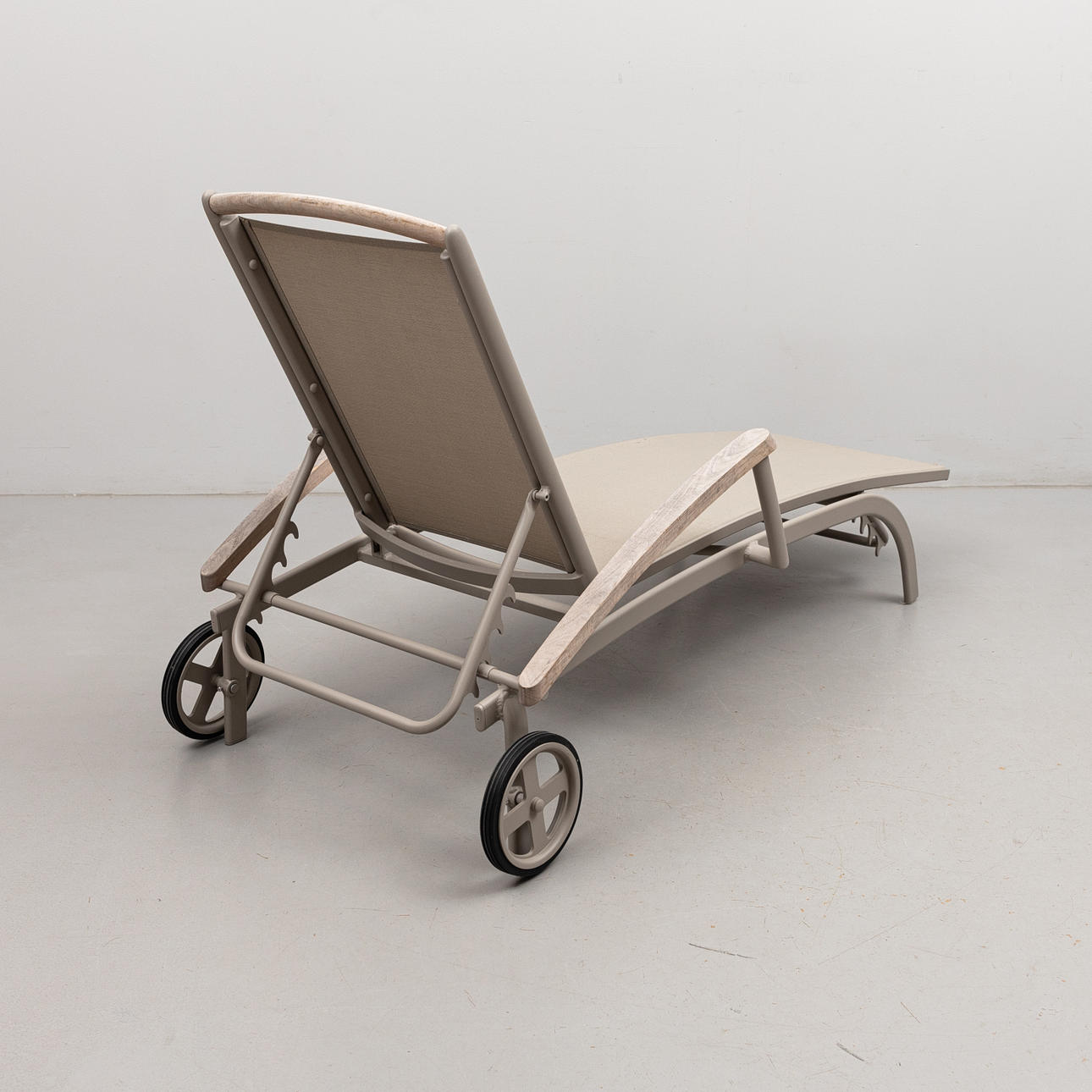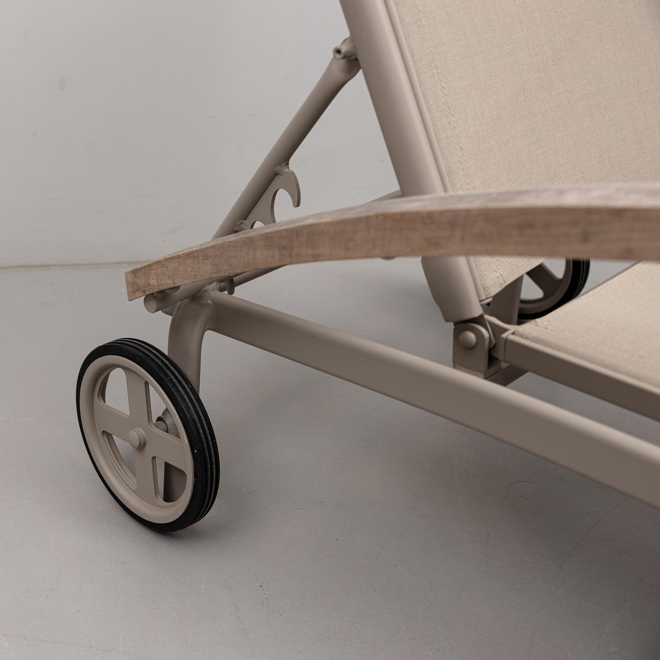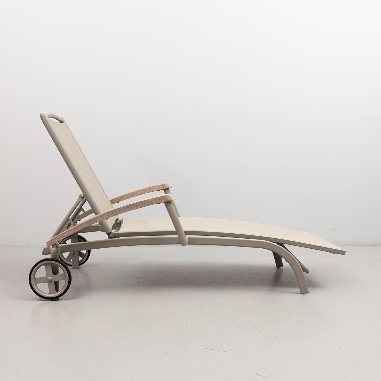 På hjul, stomma av aluminium samt teak. ryggen ställbar, går att stapla.