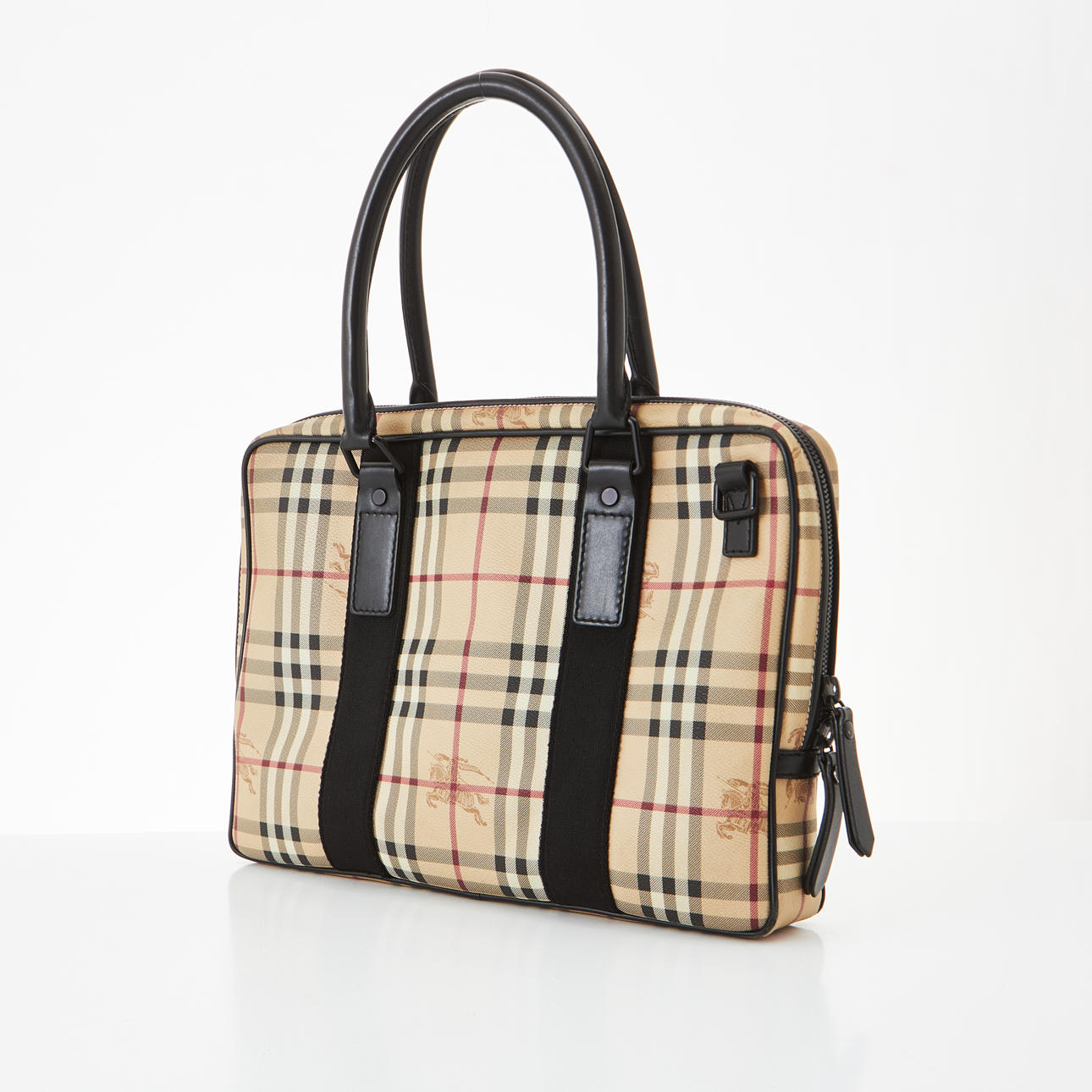 Behandlad canvas i "Haymarket check", kontrasterande detaljer i svart textil och skinn, avtag- och justerbar axelrem, med dragkedja, vadderad, fodrad i svart tyg, invändigt med datorfack, två mindre fack samt ett med dragkedja, märkt "Burberry made in Italy", medföljande äkthetskort, kvitto och etikett från inköpstillfälle samt dustbag, mått ca 37x26x6.5cm.