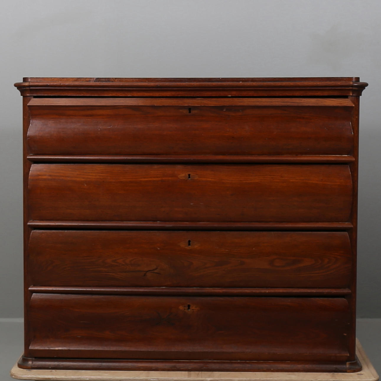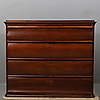 Fyra lådor, rundade hörn. Rak modell med profilerade lådfronter. Längd 113, bredd 46, höjd (exkl ben) 95 cm.