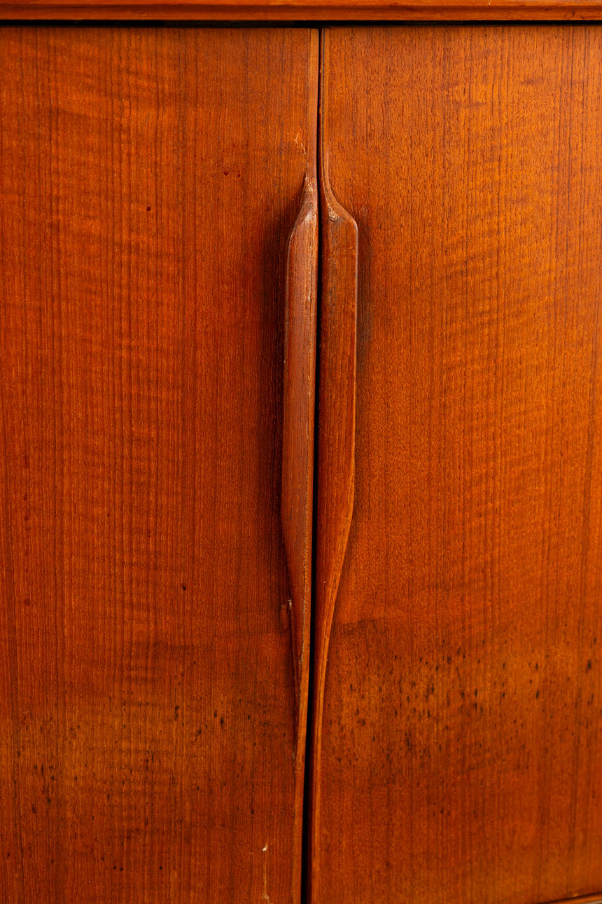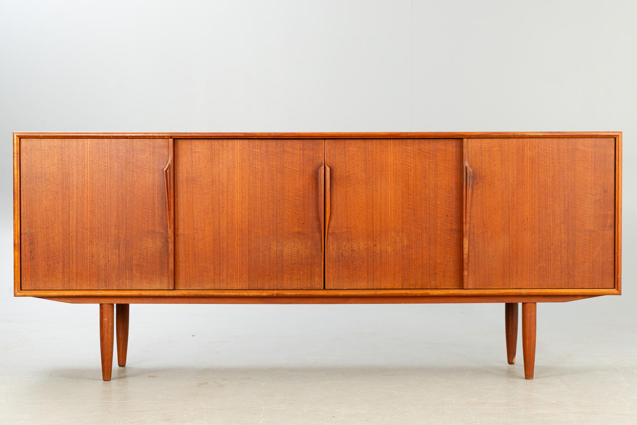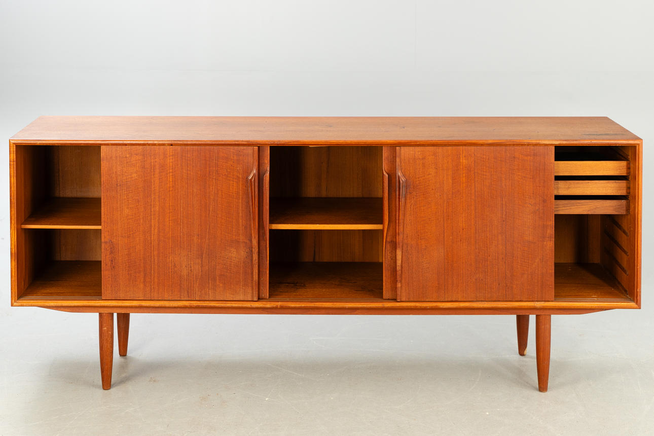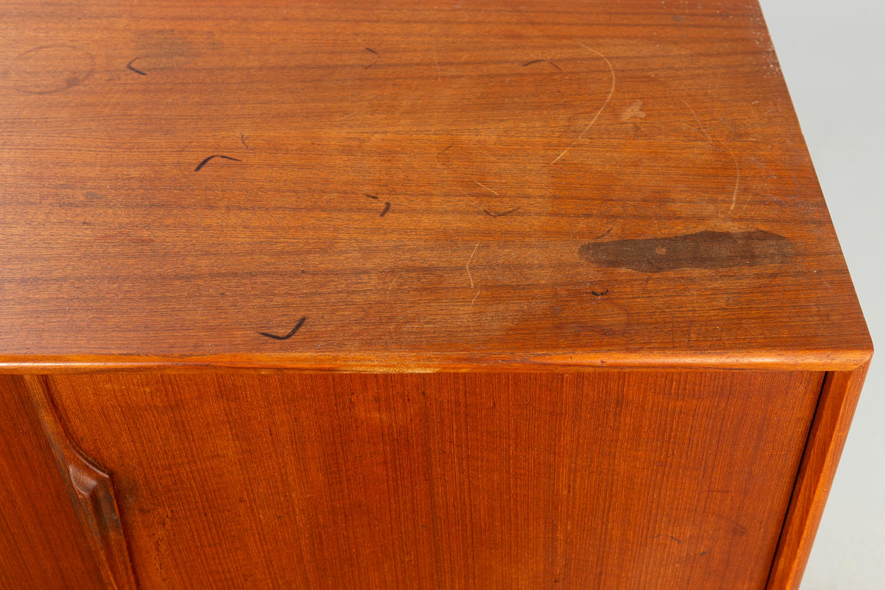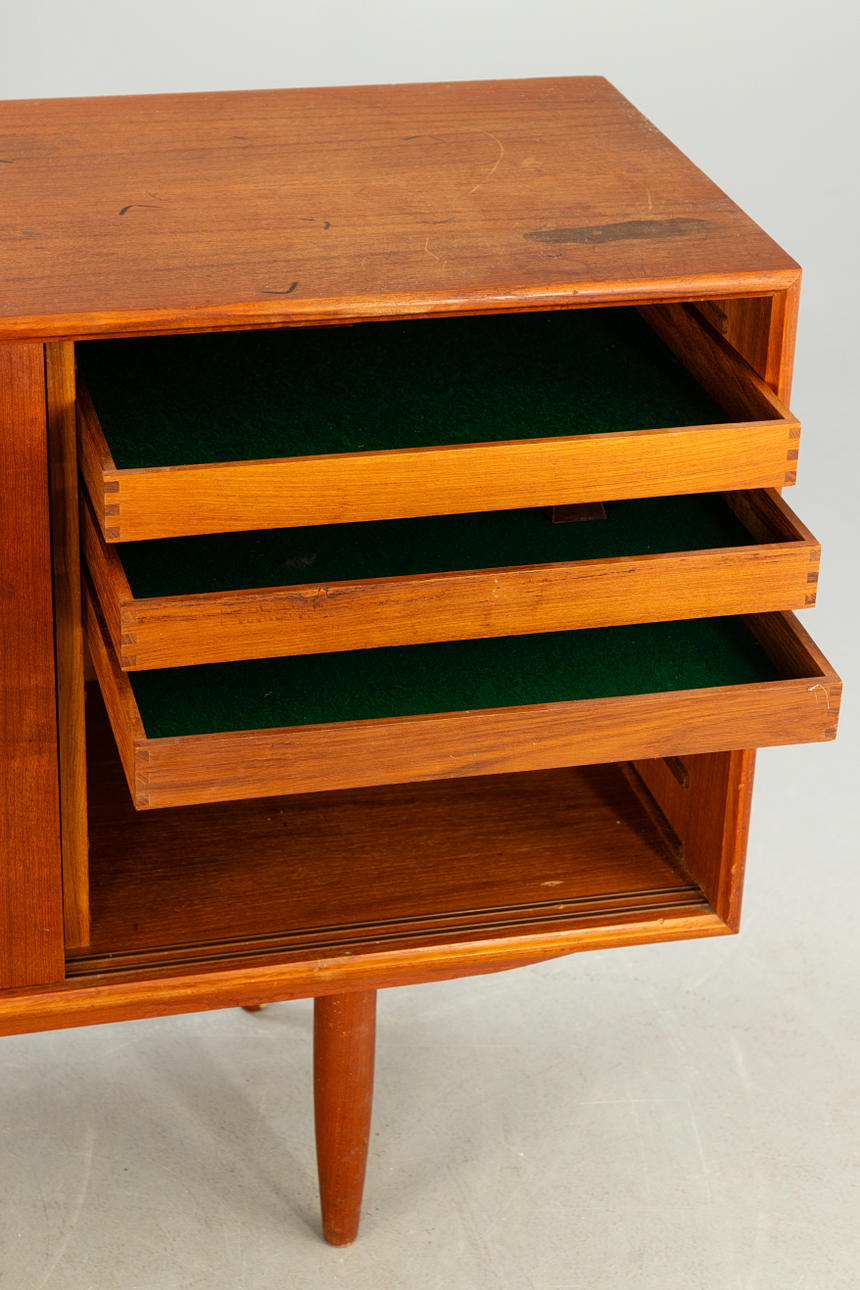 teakträ 4 skjutdörrar, hyllor och lådor.