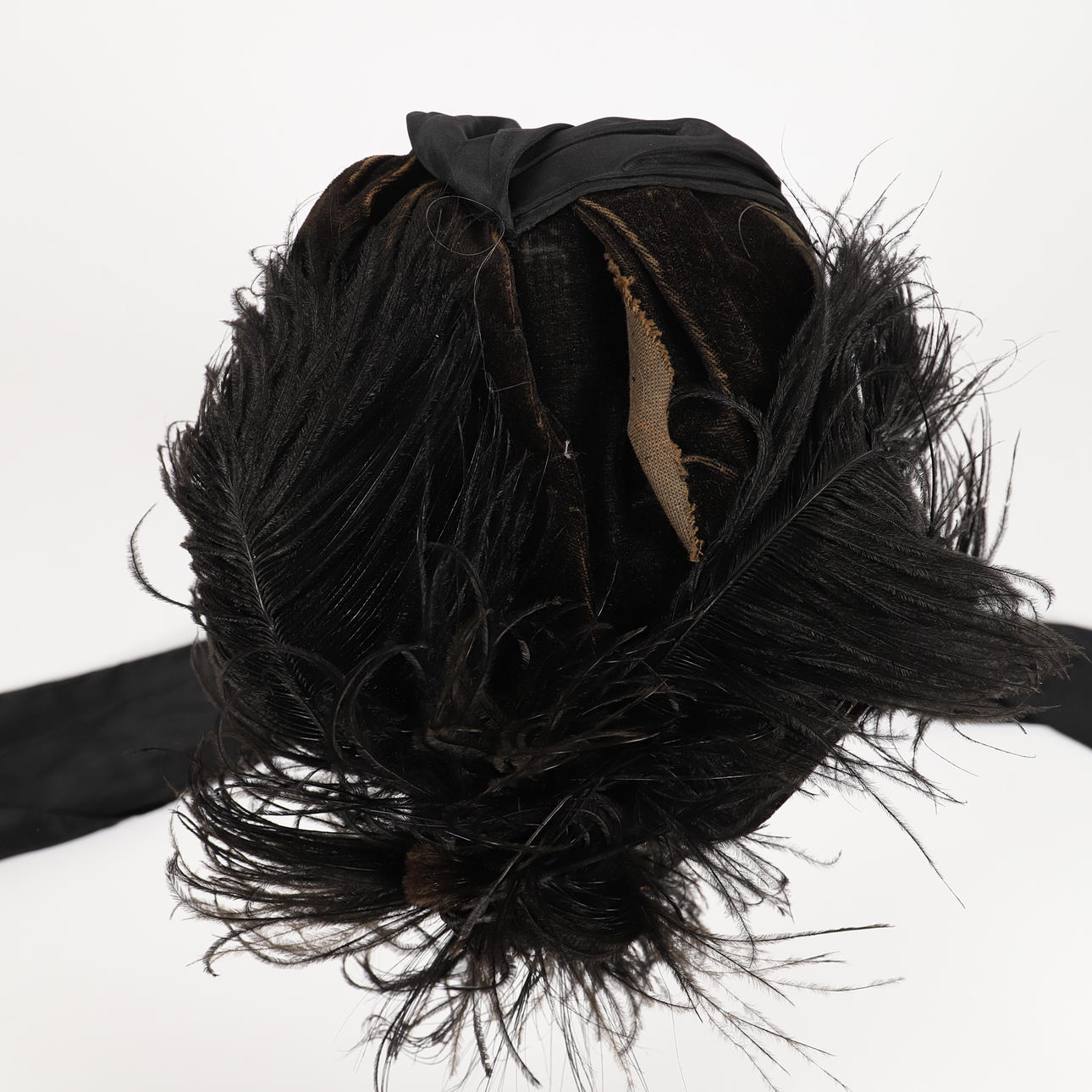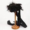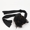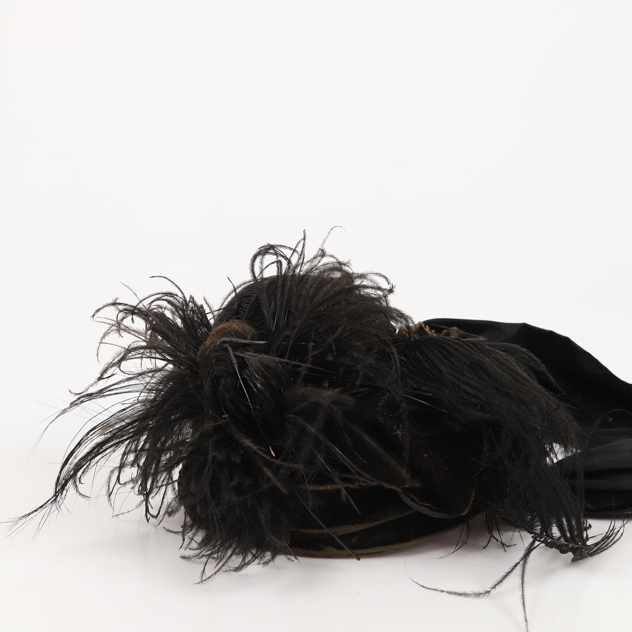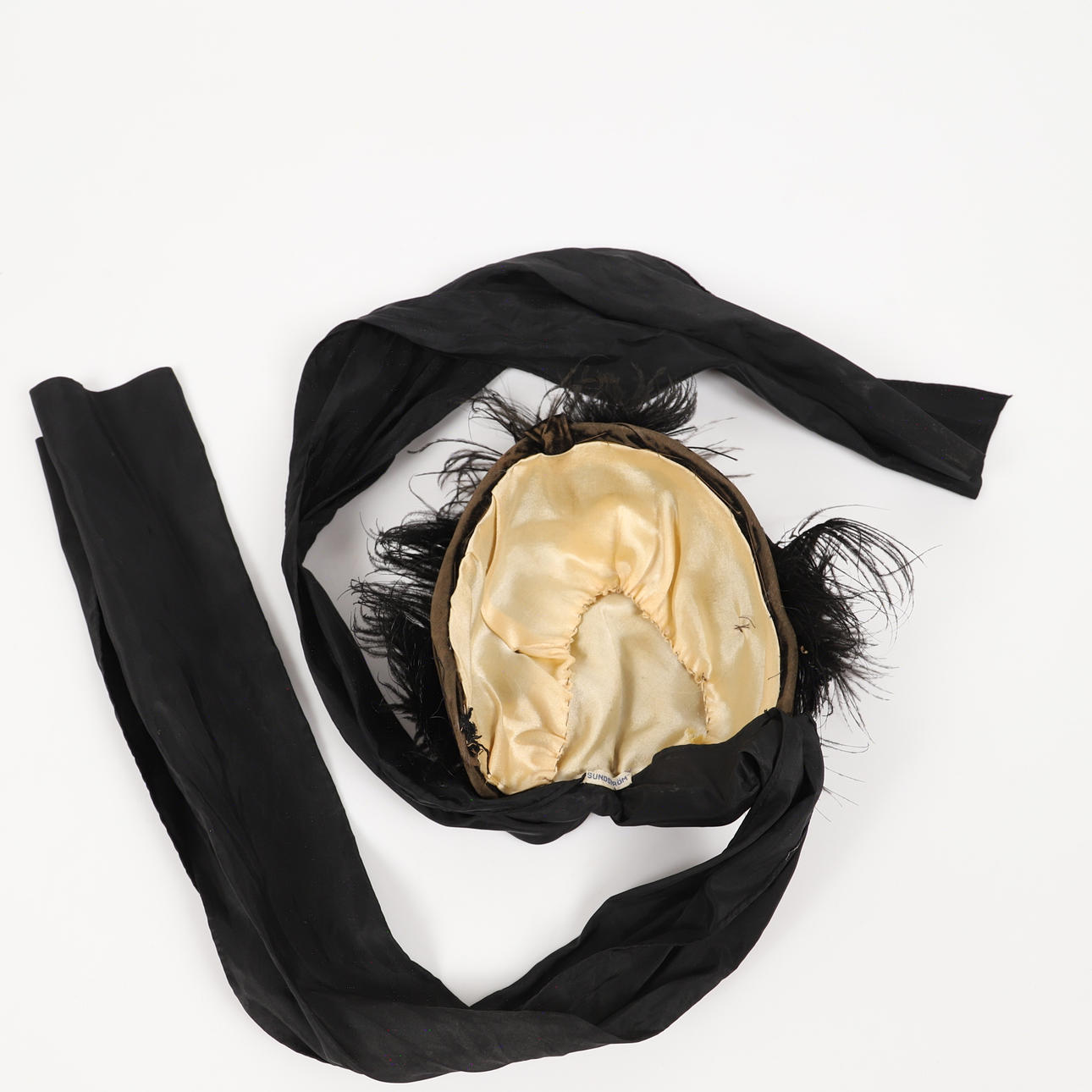 Hatt med knytband i textil, urnupet för hårknut i nacken, ca 20 x 19 cm, knytband längd ca 80, bredd 32 cm.