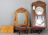Byråspegel, björk, höjd 55 cm. Väggur, ek, höjd 70 cm. Fotpallar, 2 st, 1800-tal, diameter 31 cm. Syskrin, björk, inläggningar i mahogny, längd 25 cm.