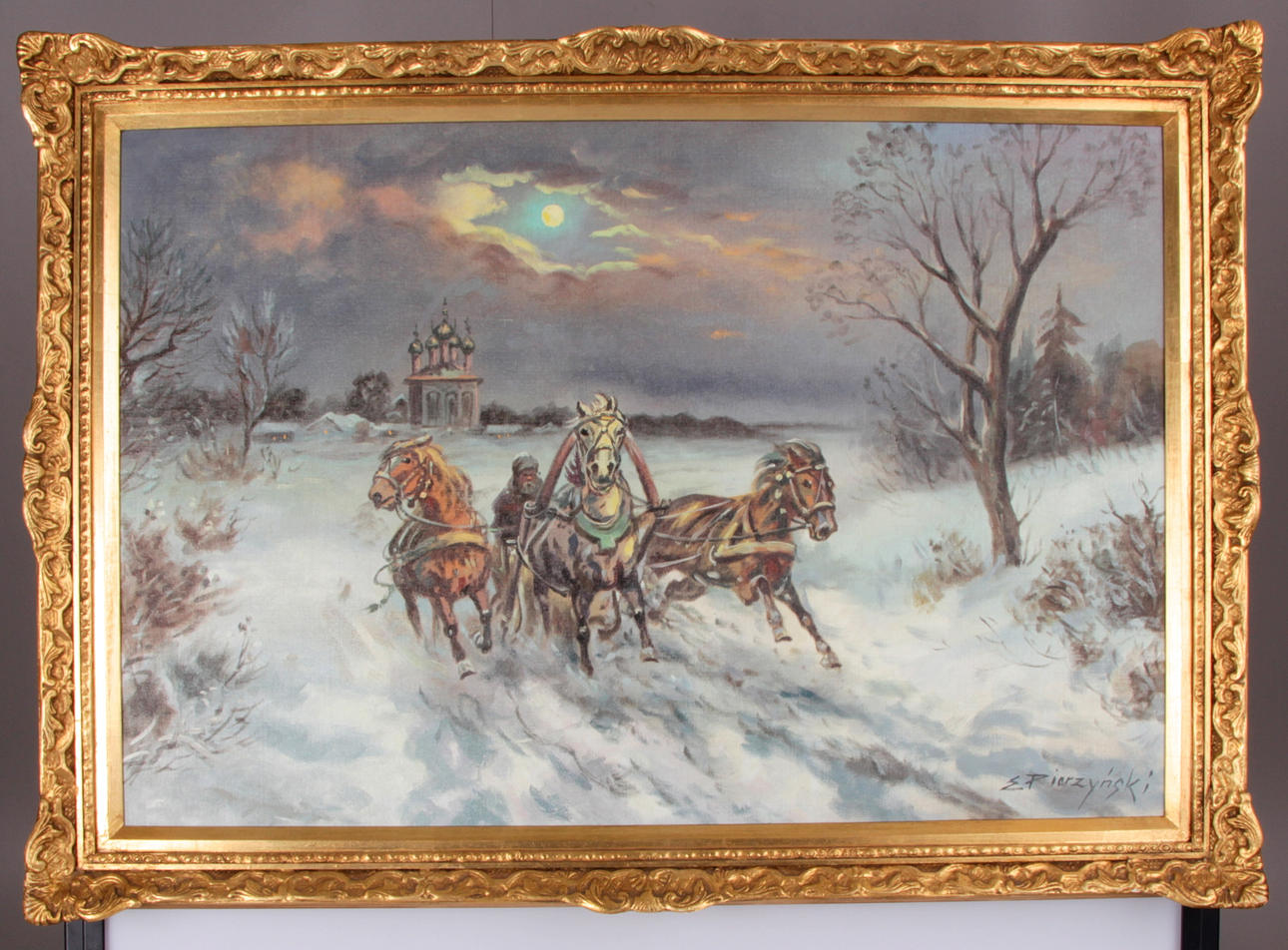 366559. EDWARD PIERZYNSKI. Olja på duk, hästekipage i snölandskap, signerad.
