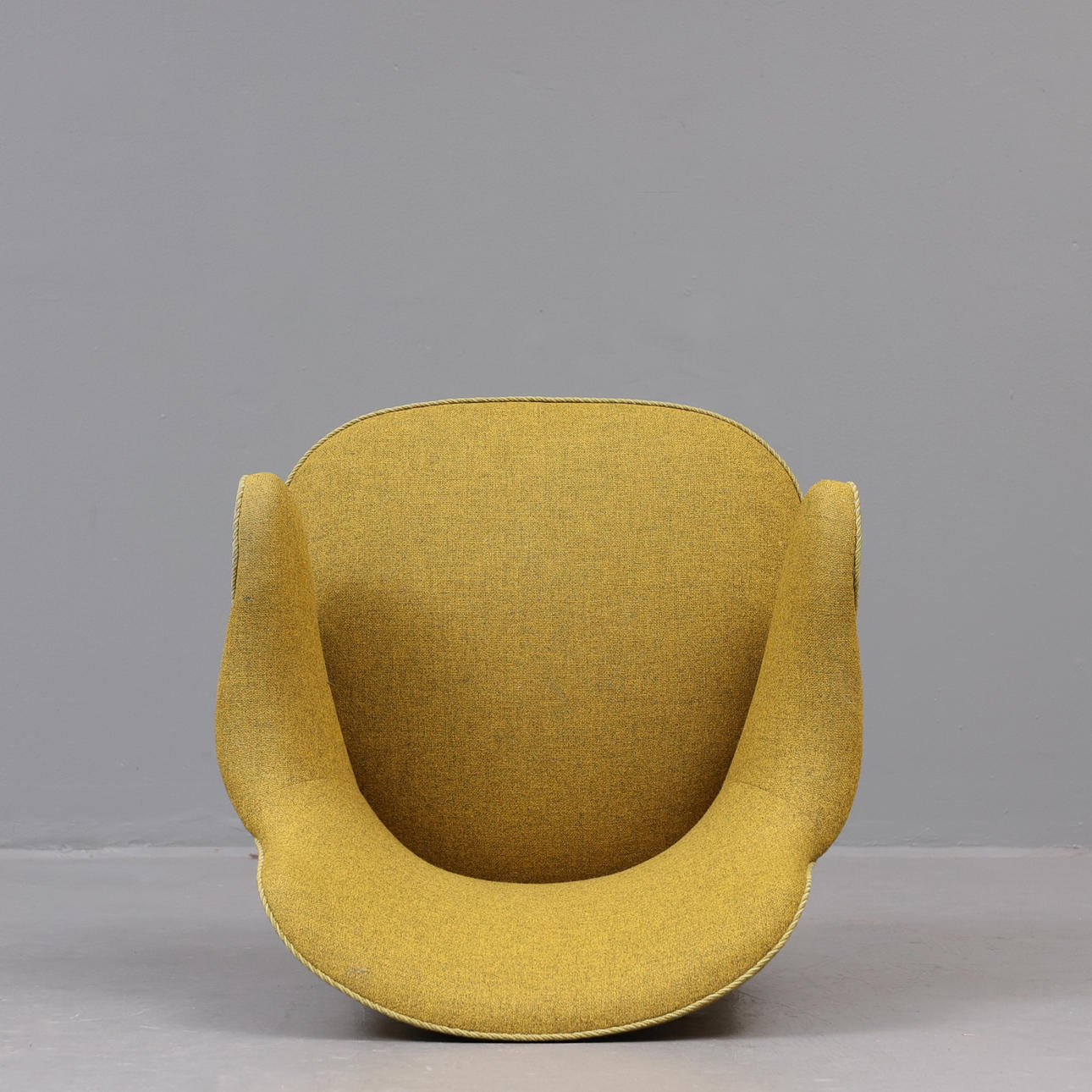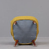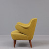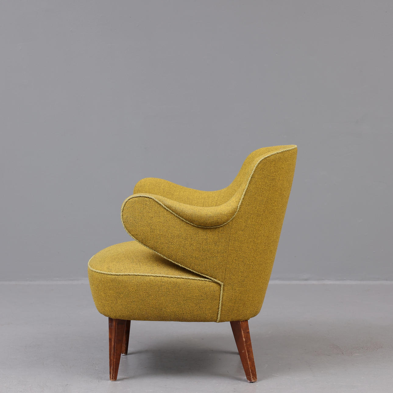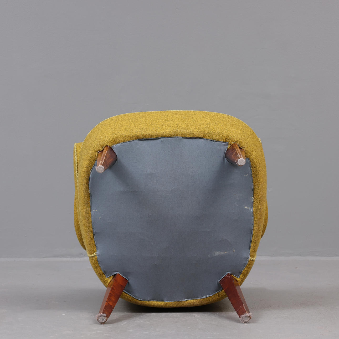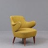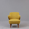 Helstoppad fåtölj klädd i gulgrön ylletextil, på ben i bonad björk. Mått: höjd 75 cm, bredd 64 cm, sitthöjd ca. 44 cm.
