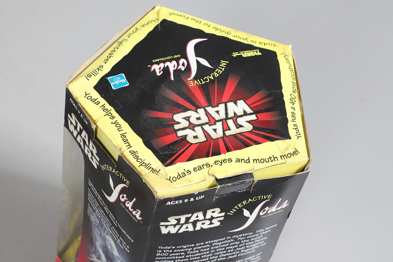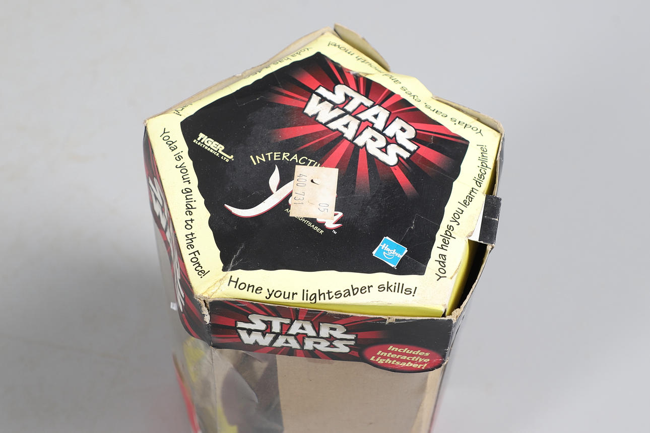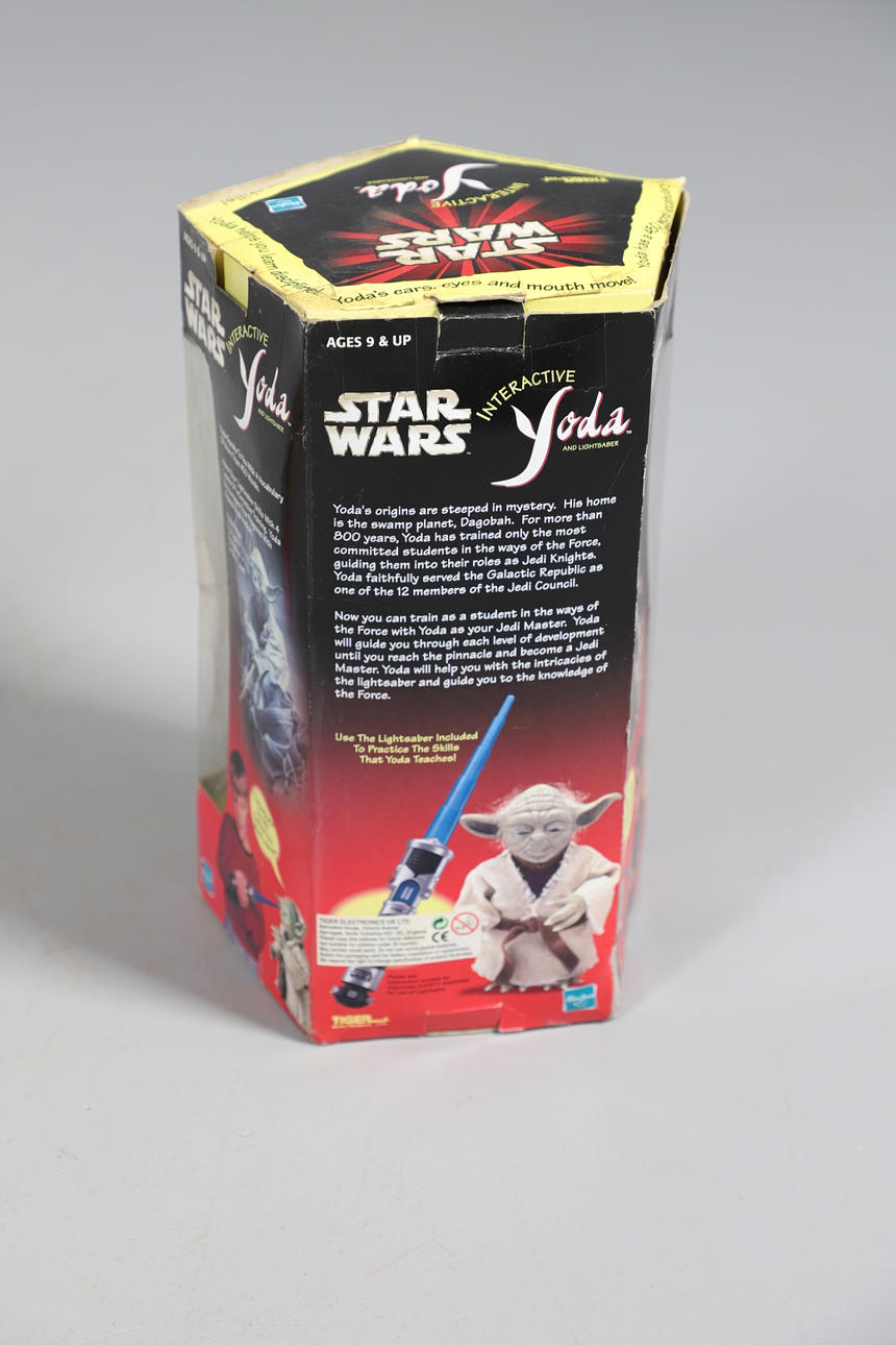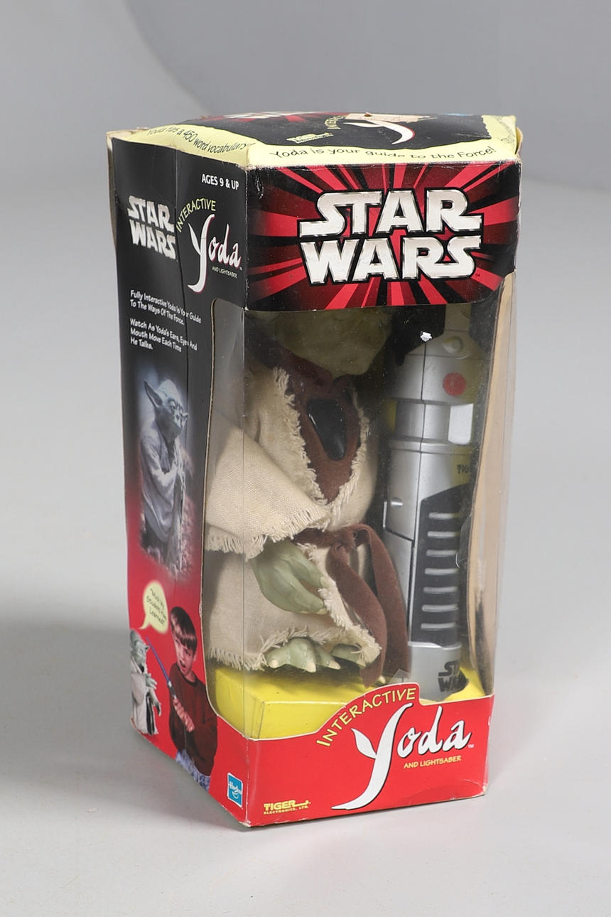Två boxade Interactive Yodas med ljussabel, boxade Corgi James Bond Aston Martin och två boxade bilar.