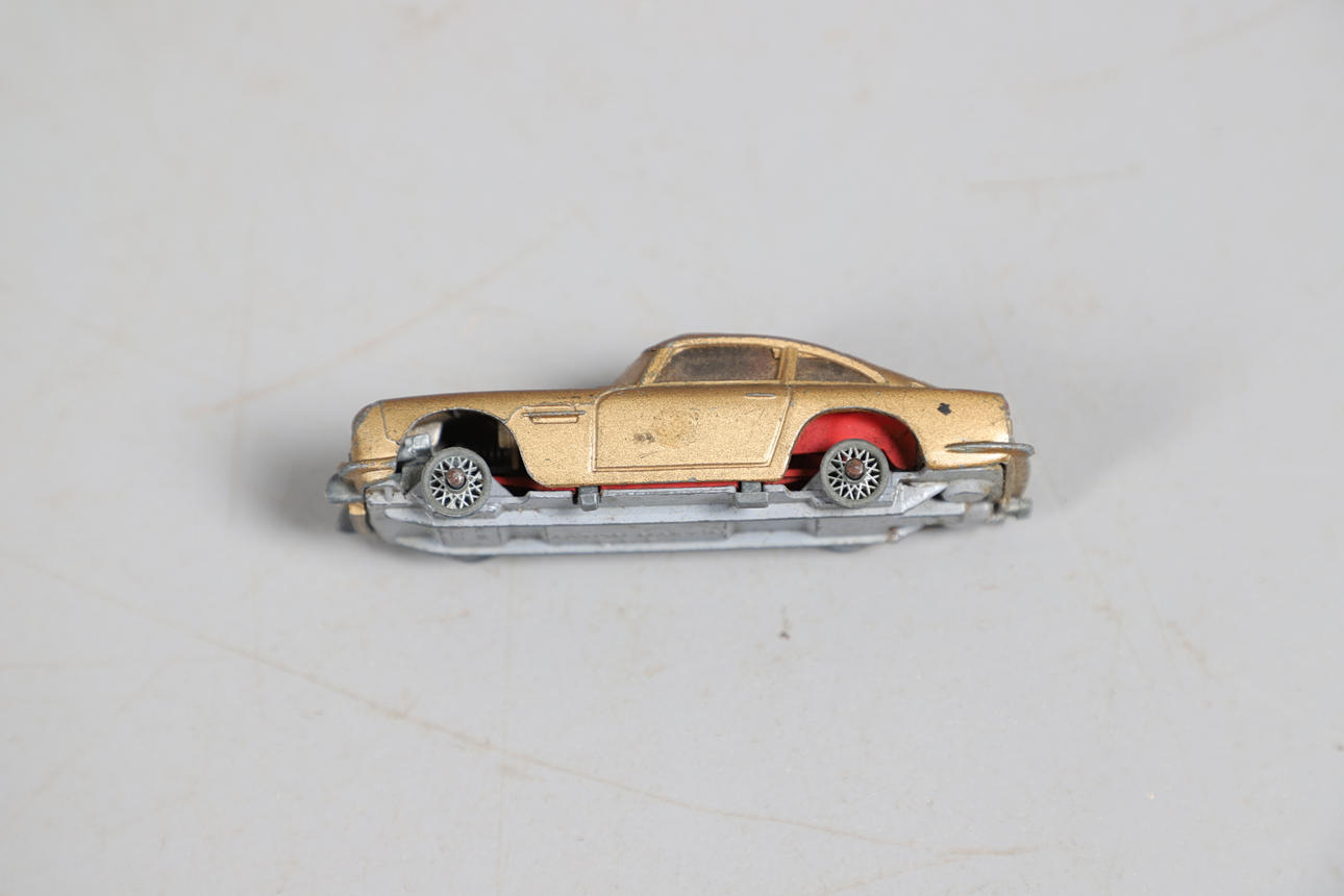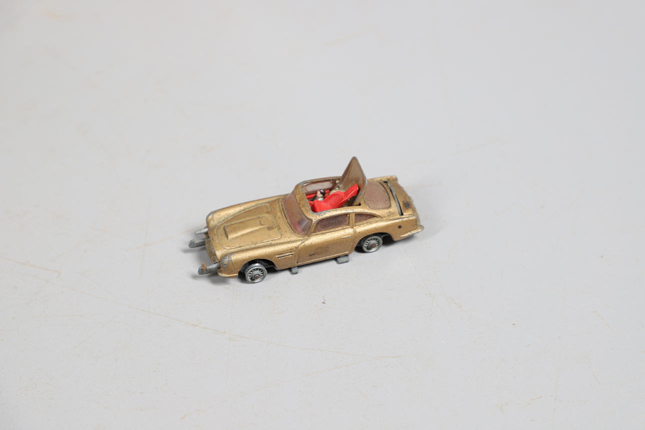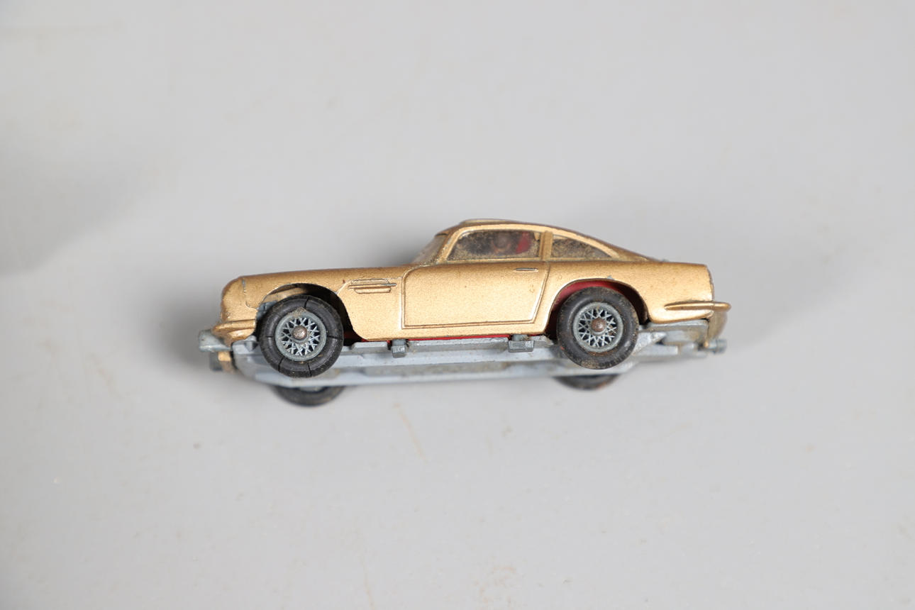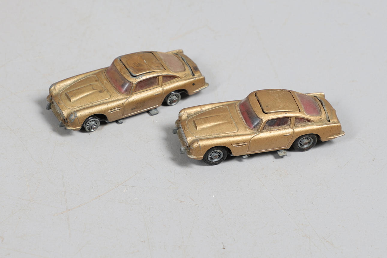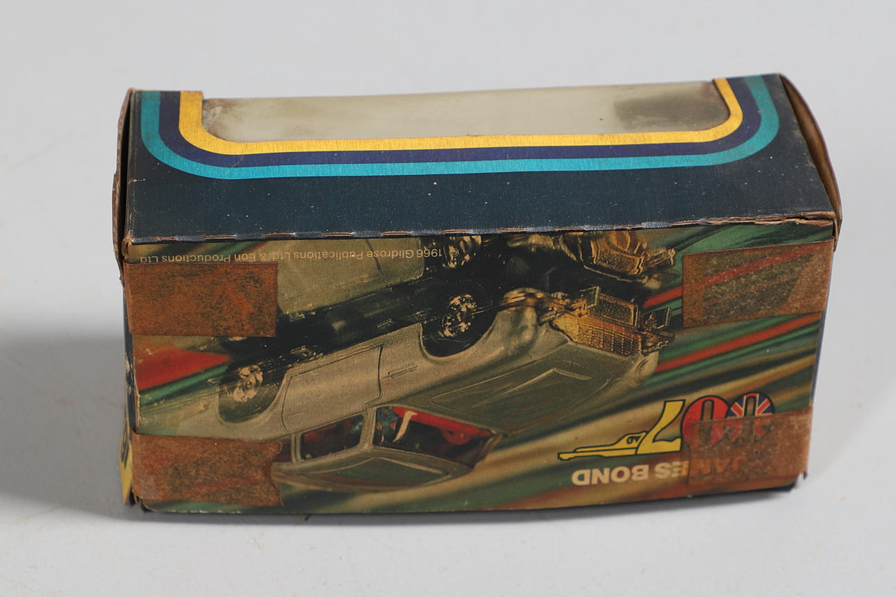 Två boxade Interactive Yodas med ljussabel, boxade Corgi James Bond Aston Martin och två boxade bilar.