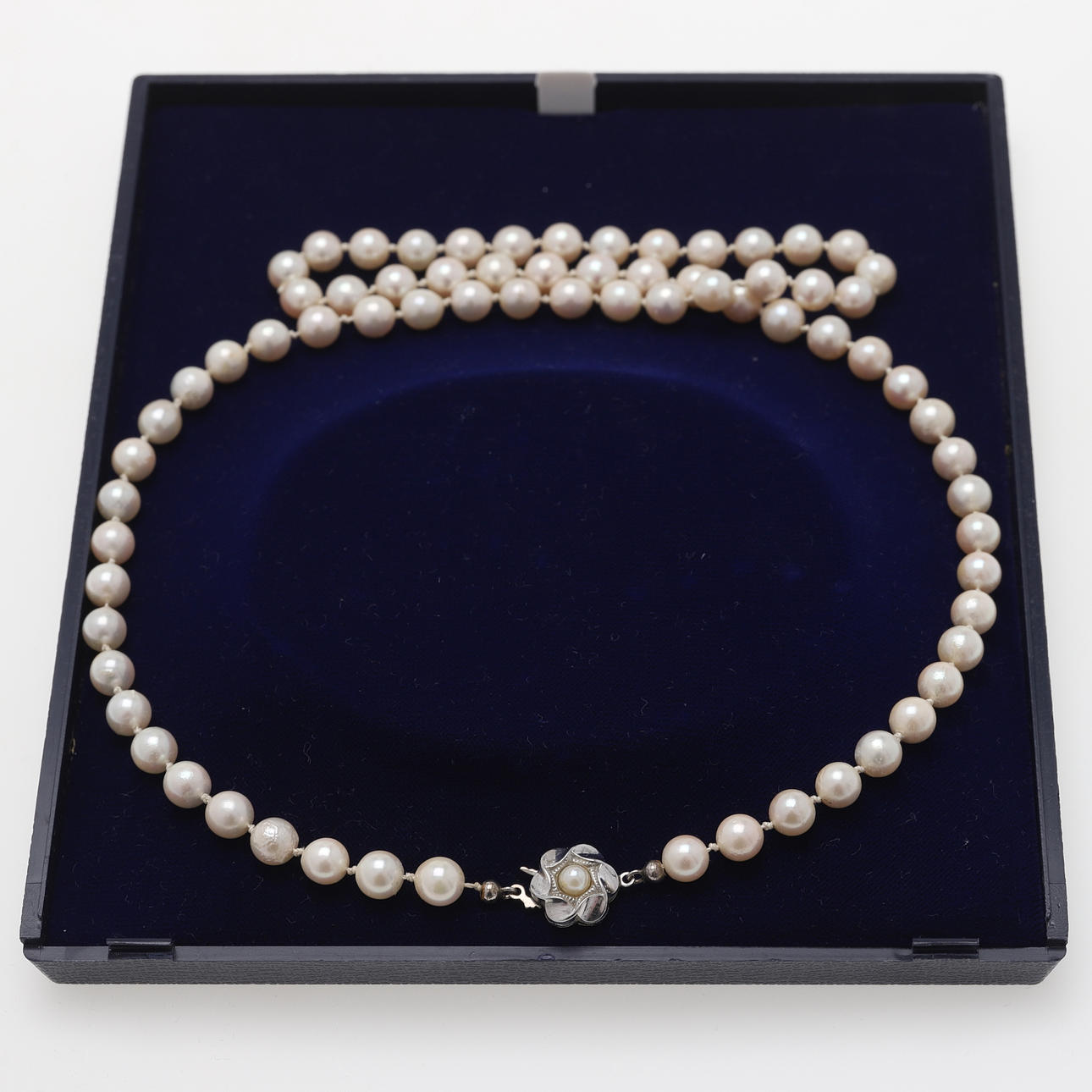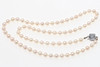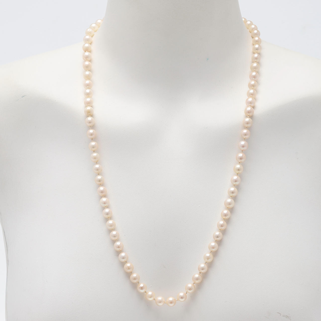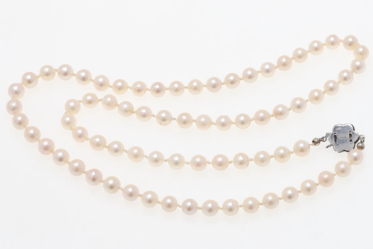 Längd ca 62 cm Odlade sötvattenspärlor med smått puderrosa nyans, diameter på pärlor ca 7,2 mm Vikt ca 38,9 gram Etui medföljer.