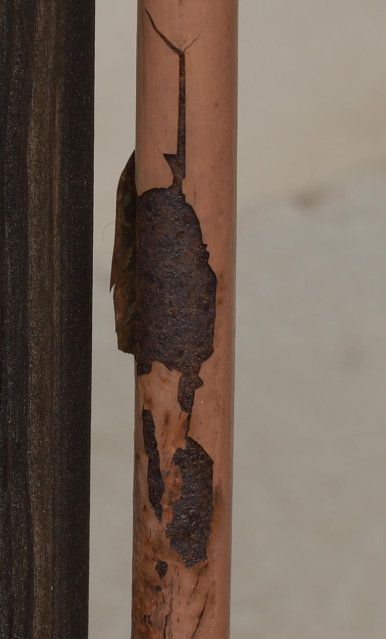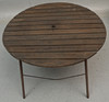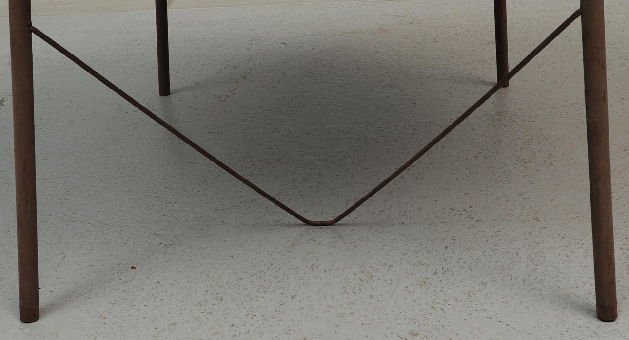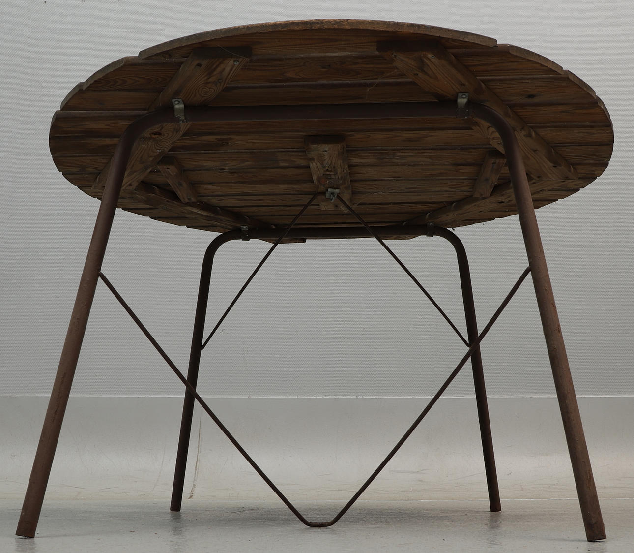 Rostskador, saknas en spännhållare till bordets ben, bruksslitage, ytsmuts.